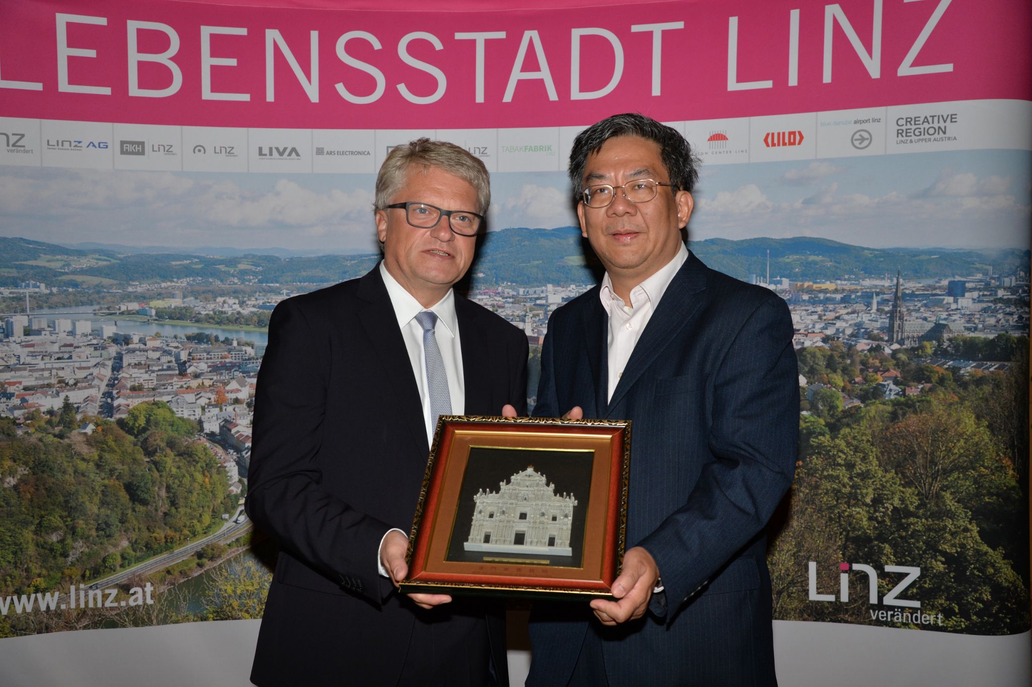 During this visit, OM’s delegation, including the Vice-President of IC, Leong Hio Ming, Maestro Lü Jia and all the musicians were received by the Mayor of Linz, Mr. Klaus Luger, at the town’s City Hall. During this meeting, the Mayor expressed his thanks to OM for its visit and concerts of outstanding quality, thereby contributing for the understanding of the achievements of contemporary China in the cultural and musical fields as well as to the establishment of a friendship bridge between the two countries. Leong Hio Ming, in turn, thanked the local government for the invitation and offered a relief painting depicting the Ruins of St. Paul as a souvenir.
