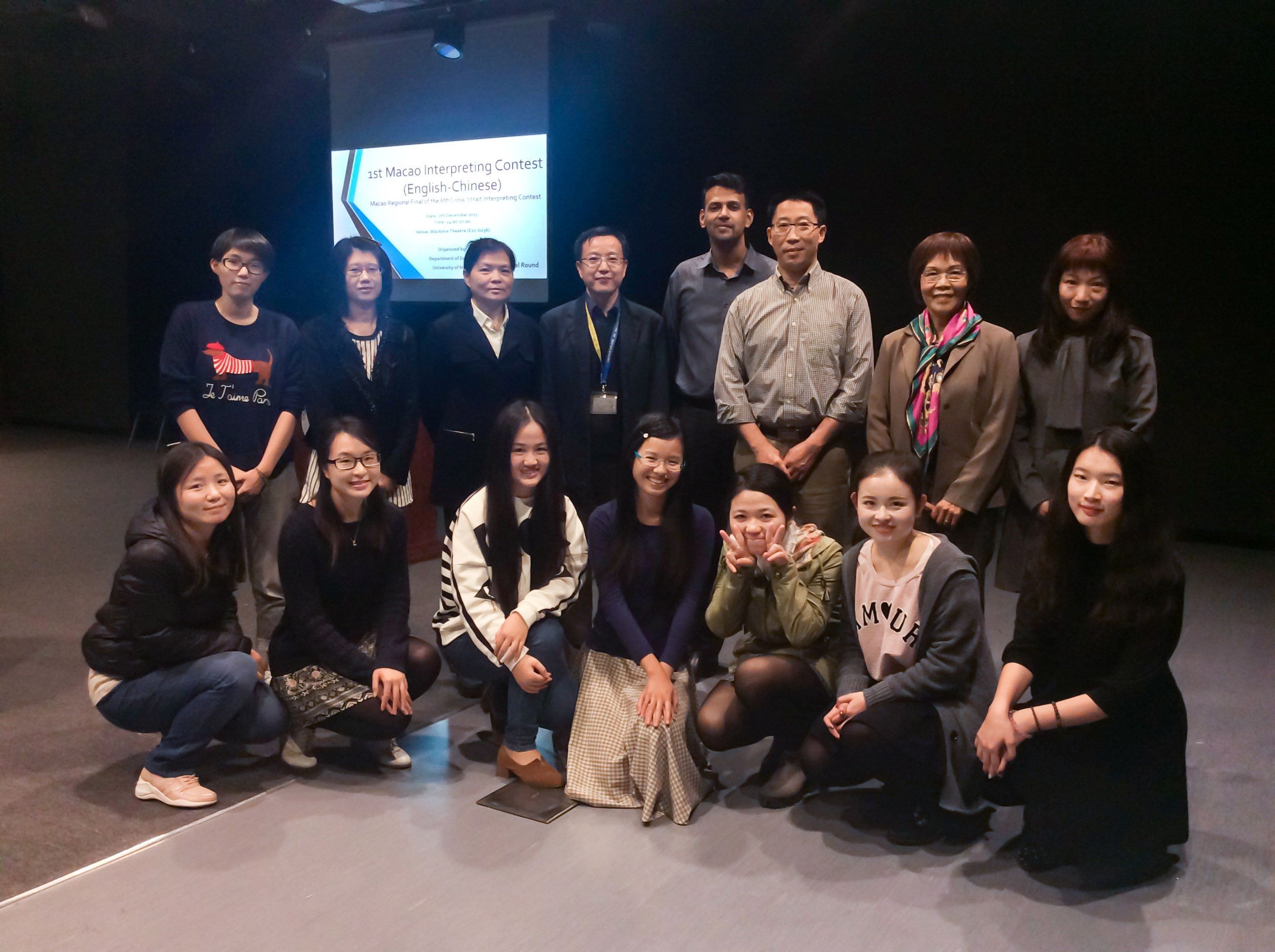 Hosted by UM’s Department of English, the interpreting contest consisted of three rounds. In the first round, contestants were required to interpret a 90-second-long speech from English to Mandarin with the help of notes. In the second round, contestants were required to deliver the main ideas of a 60-second-long Mandarin speech in English in 45 seconds without taking notes. In the third round, contestants were required to do consecutive interpreting of a conversation between a Mandarin speaker and an English speaker with the help of notes. The panel of judges included Zhang Meifang, Li Defeng, Vincent Wang, Victoria Lei, Hari Venkatesan, and Lily Lim, who are all members of the Federation of Translators and Interpreters of Macau.