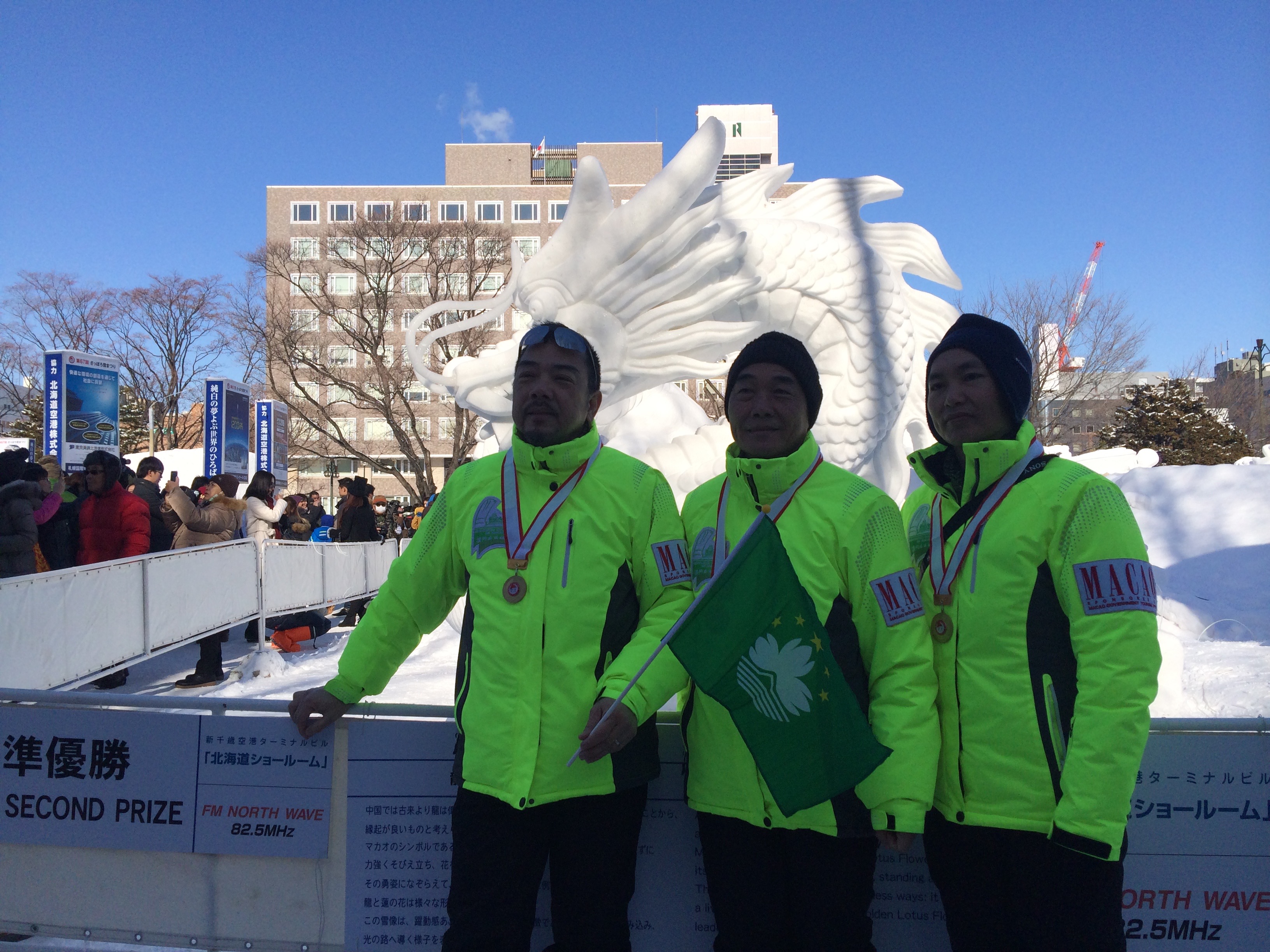 Upon the invitation of Macao Government Tourism Office (MGTO), a team of snow-carving artists from Macau Culinary Association joined the 43rd International Snow Sculpture Contest and returned home as the second-prize winner. The Secretary for Social Affairs and Culture of the Macao SAR Government Dr. Alexis Tam conveys his sincerest congratulations to the Macao snow-carving team, and believes their participation has helped promoting Macao’s destination image to international visitors.