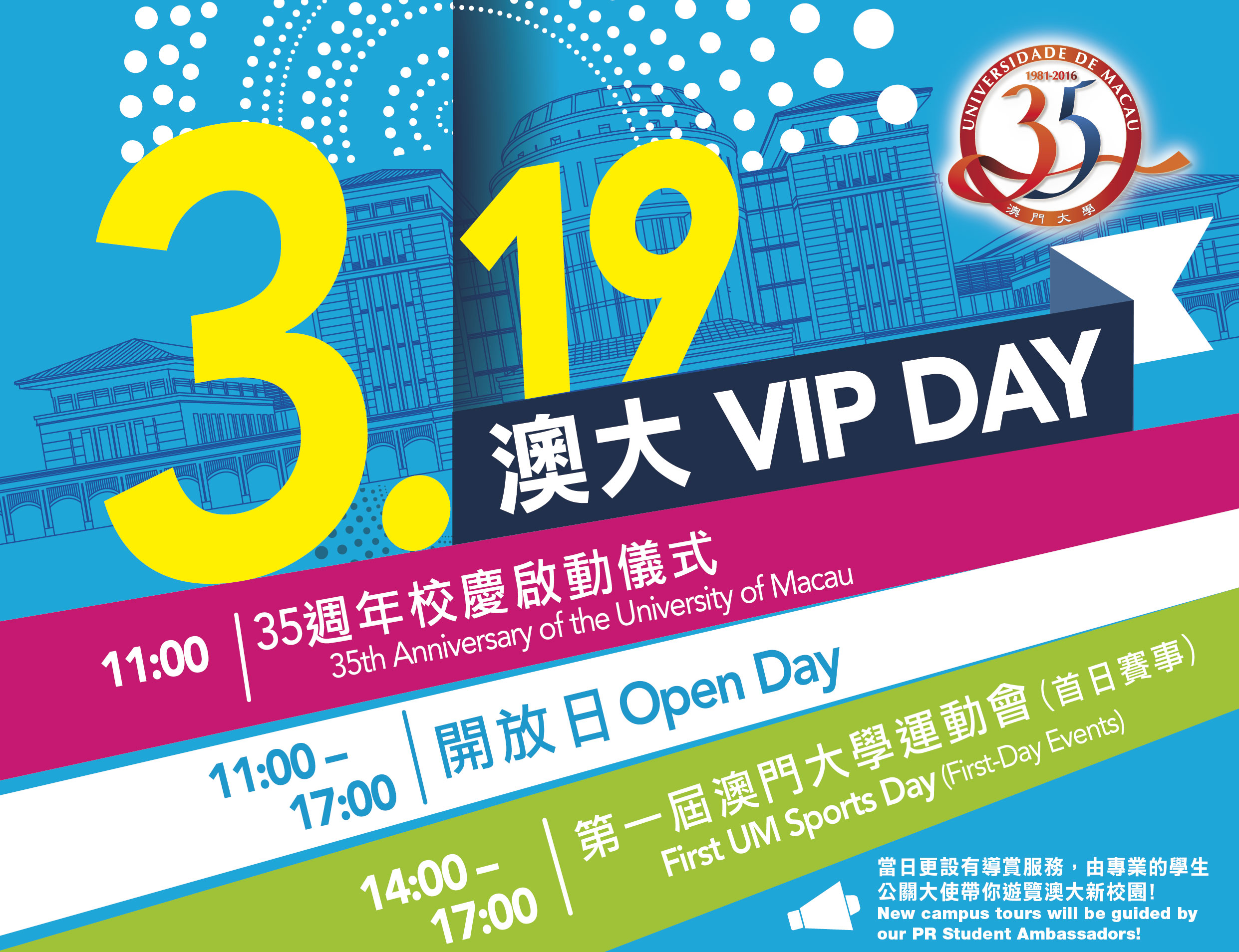 The UM VIP Day, the first major event to celebrate the 35th anniversary of the University of Macau (UM), will be held this Saturday (19 March). There will be an opening ceremony, a carnival-style Open Day, and the First UM Sports Day. Those who are interested are welcome to visit the UM campus with their families and friends this Saturday to participate in the various fun activities, including an international food festival, booth games, and performances.