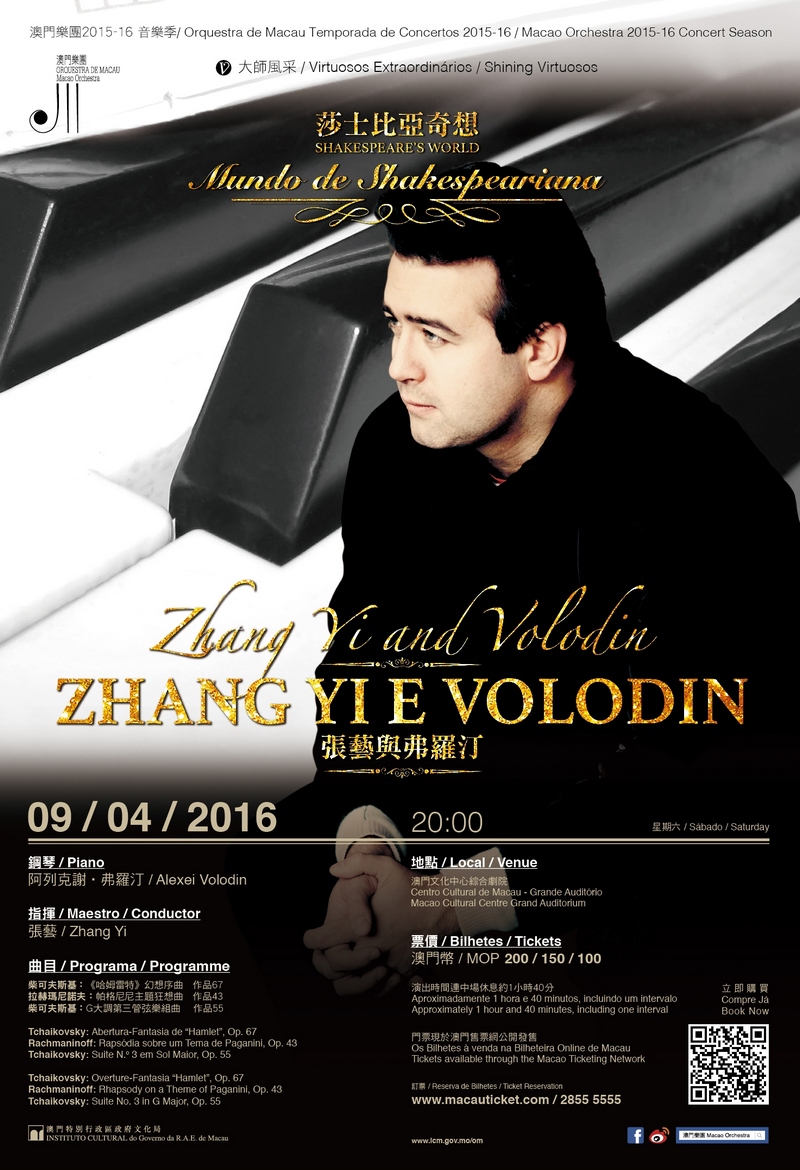 This year marks the 400th anniversary of William Shakespeare’s death and the Macao Orchestra specially presents thematic concerts about this master of literature. Led by highly acclaimed Chinese conductor Zhang Yi, the Orchestra joins hands with internationally renowned Russian pianist Alexei Volodin to perform the most well-known piece of Sergei Rachmaninoff, Rhapsody on a Theme of Paganini, Op.43, which is also the soundtrack of the movie Somewhere in Time, creating a romantic, poetic and fascinating illusion. The programme of the concert also features two extraordinary pieces about Shakespeare, Tchaikovsky’s Overture-Fantasia “Hamlet”, Op. 67 and the Suite No. 3 in G Major, Op. 55, which demonstrate the sensibility and ecstasy of the composer by the master, offering aficionados an evening of fantasy and romance.