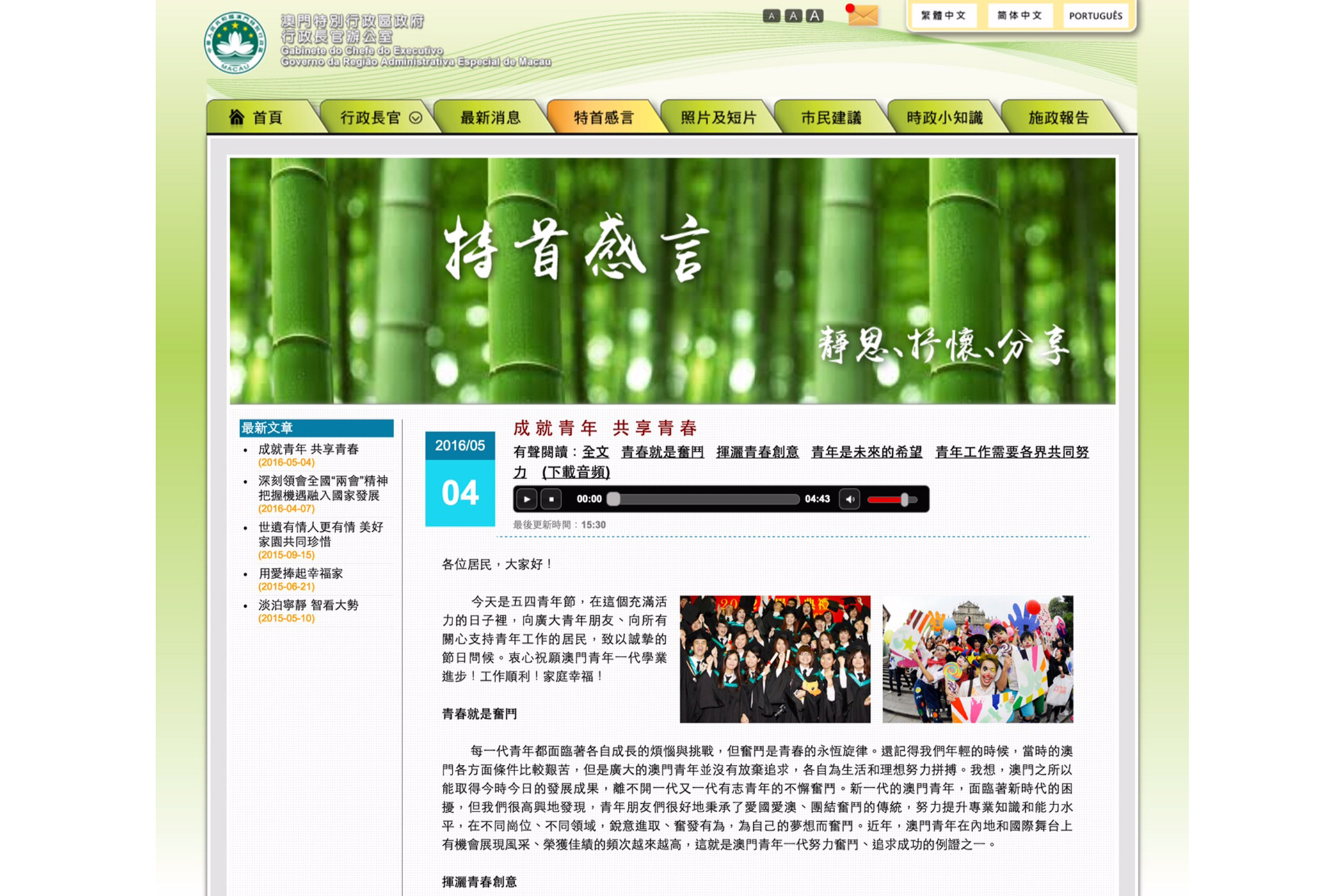 The full text of the article is published in Chinese and Portuguese, and is available on the website of the Chief Executive’s Office (https://www.gce.gov.mo).