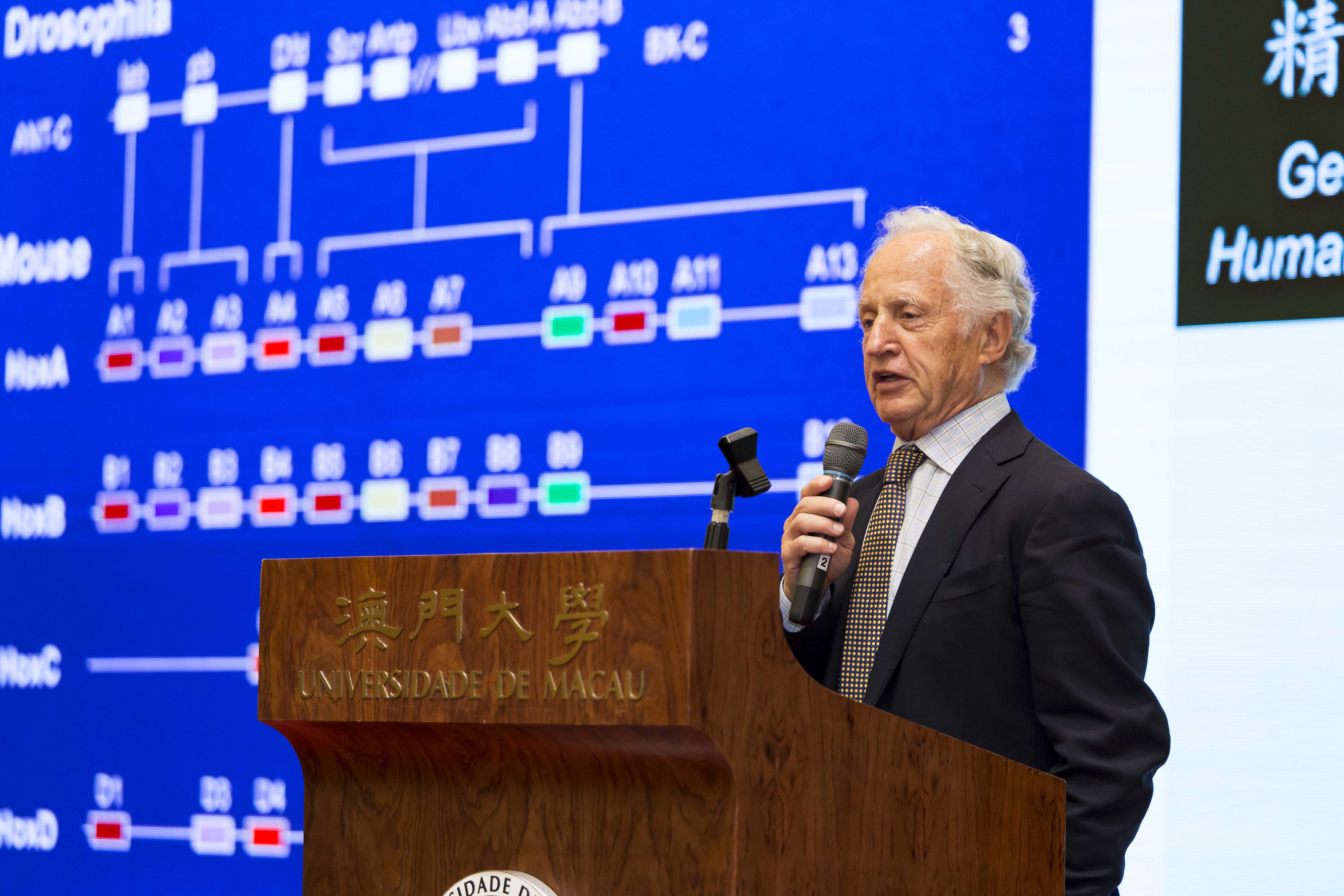 Prof Mario Capecchi, a co-recipient of the 2007 Nobel Prize in Physiology or Medicine, today (23 May) was awarded a Doctor of Science honoris causa degree by the University of Macau (UM), in recognition of his contributions to the development of gene targeting and biomedical treatment for cancer. Following the ceremony, Prof Capecchi presented a Doctor honoris causa Lecture, in which he discussed different kinds of gene mutation technologies and how the murine models derived from these technologies can be used to treat cancer.
