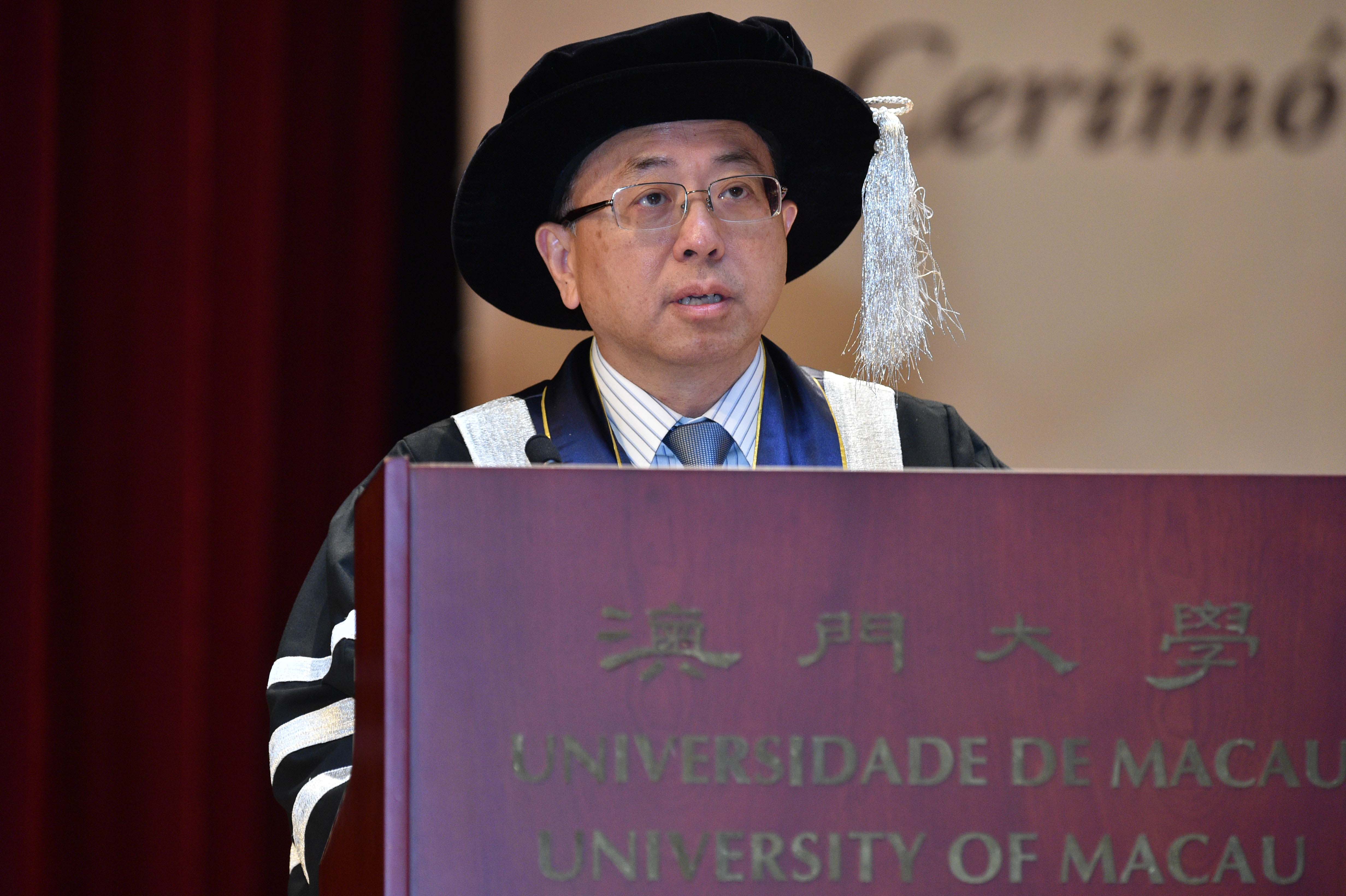 UM’s Vice Rector (Academic Affairs) Lionel Ni read the citation for Dr Tse. Dr Tse completed his secondary education in Macao. He later received his bachelor of science degree in mathematics as well as master’s and PhD degrees in physics in the United States. ‘During his 30-year presidency at Hong Kong Baptist University, Dr Tse actively promoted holistic education and was successful in raising its academic standards to the international level,’ read the citation. ‘Under his leadership, Hong Kong Baptist College was upgraded as the Hong Kong Baptist University. In 2001, invited by the then chief executive of the Macao SAR, Dr Tse became the chair of the University Council of UM, which position he held until 2014, with the major agenda of revamping UM’s governance, revising its charter, expediting its modernisation and internationalisation, and leading the new campus project.’ The citation hailed Dr Tse as a ‘miracle worker’ who has made significant contributions to the two universities in two different cities.