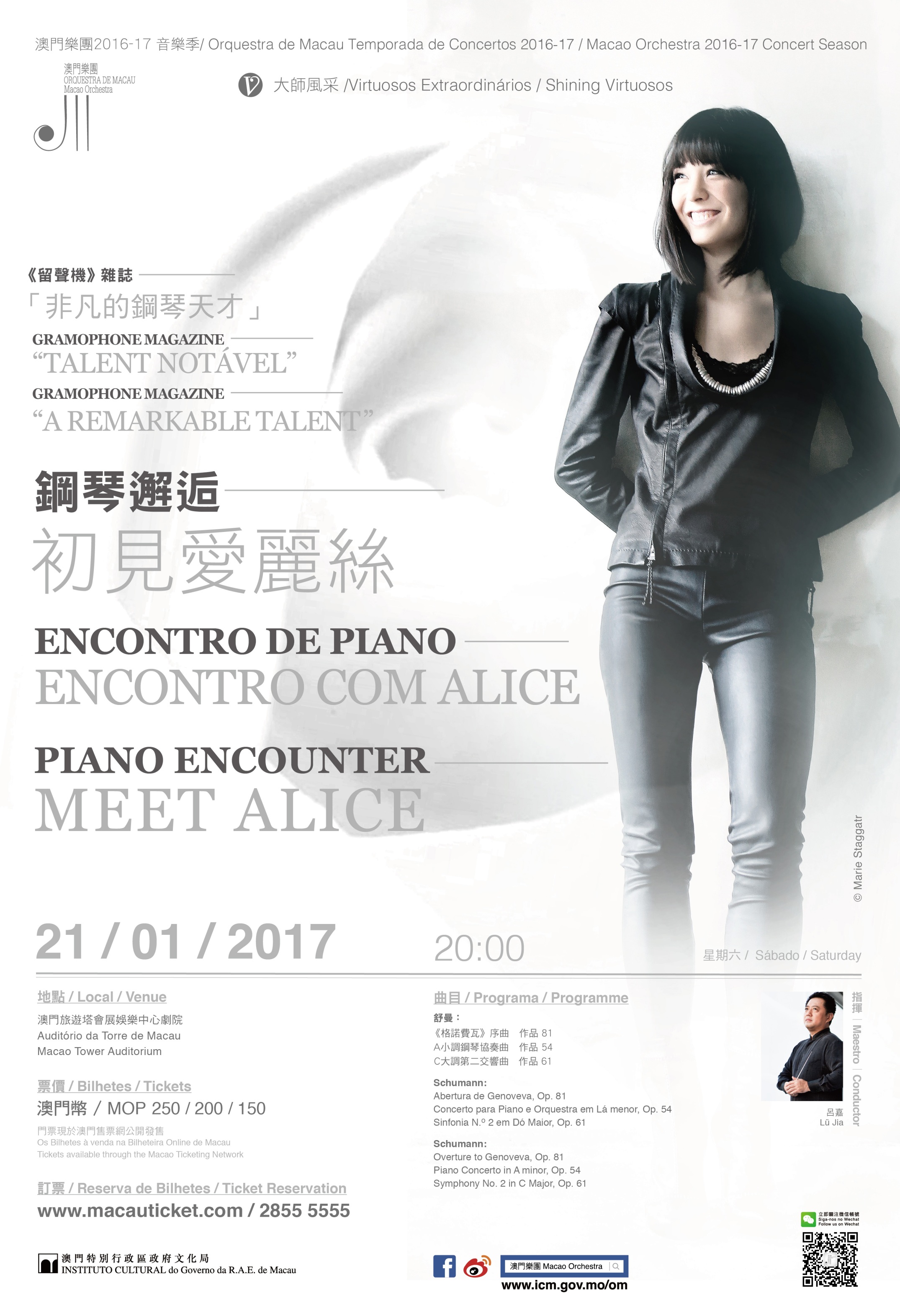 Tickets for the concert “Piano Encounter - Meet Alice” are priced at MOP250, MOP200 and MOP150, with various discount packages available. Ticketing Hotline: 2855 5555. For the electronic version and complete programme of the 2016-2017 Macao Orchestra Concert Season, please visit OM’s website: www.icm.gov.mo/om.