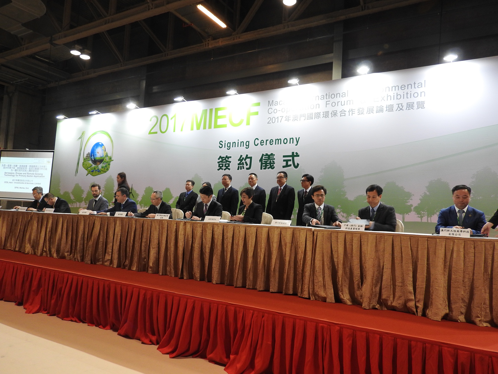 A Signing Ceremony took place at 5:30pm today, the first day of 2017MIECF, at Exhibition Hall A of the Venetian Macao-Resort-Hotel. A total of 29 agreements were signed, covering co-operation between business associations, environmental technical co-operation, environmental project co-operation, projects related to photovoltaic solar energy systems, waste recycling, air quality projects, creation of a big-data platform related to environmental protection and energy saving, and agency services for environmental protection products. The organisations signing the agreements hailed from several countries and regions, including Mainland China, Cambodia, Italy, Portugal, Vanuatu, Taiwan, Hong Kong and Macao.