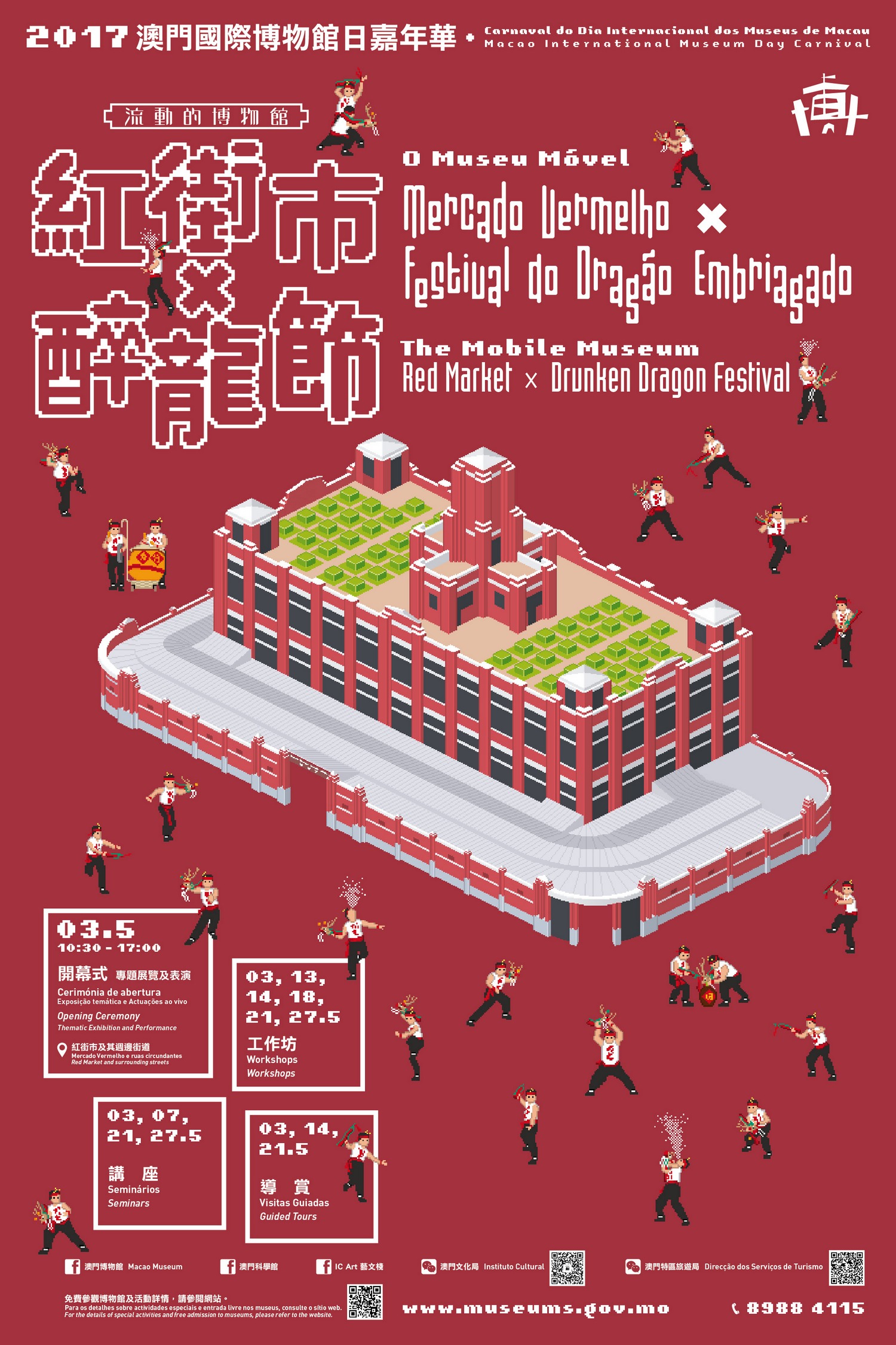 In response to this year’s International Museum Day, 17 Macao museums co-organize a large-scale annual museum event, the “2017 Macao International Museum Day Carnival” themed “The Mobile Museum – Red MarketX Drunken Dragon Festival”. The opening ceremony will be held on 3 May, at 10:30am, at the Red Market (Mercado Municipal Almirante Lacerda). Representatives of cultural entities from Guangdong Province and of the Hong Kong Home Affairs Bureau and its respective museums were invited to participate in the ceremony. The general public is welcome to attend the ceremony.