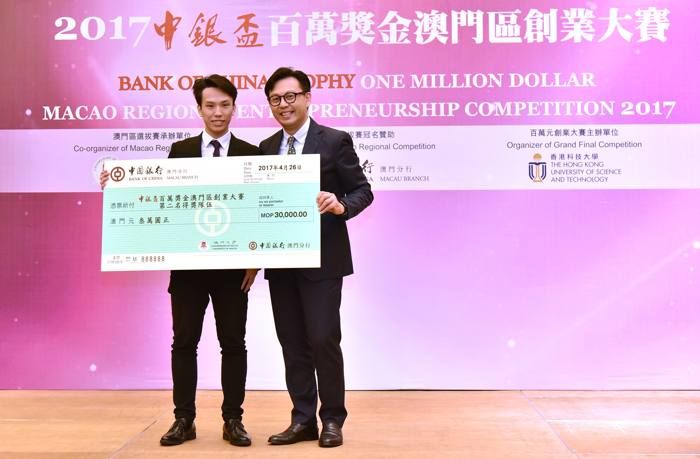 • Vice Rector (Research) Rui Martins (1st from right) and Bank of China Macau Branch Deputy General Manager Ip Sio Kai present the first prize to the winning team