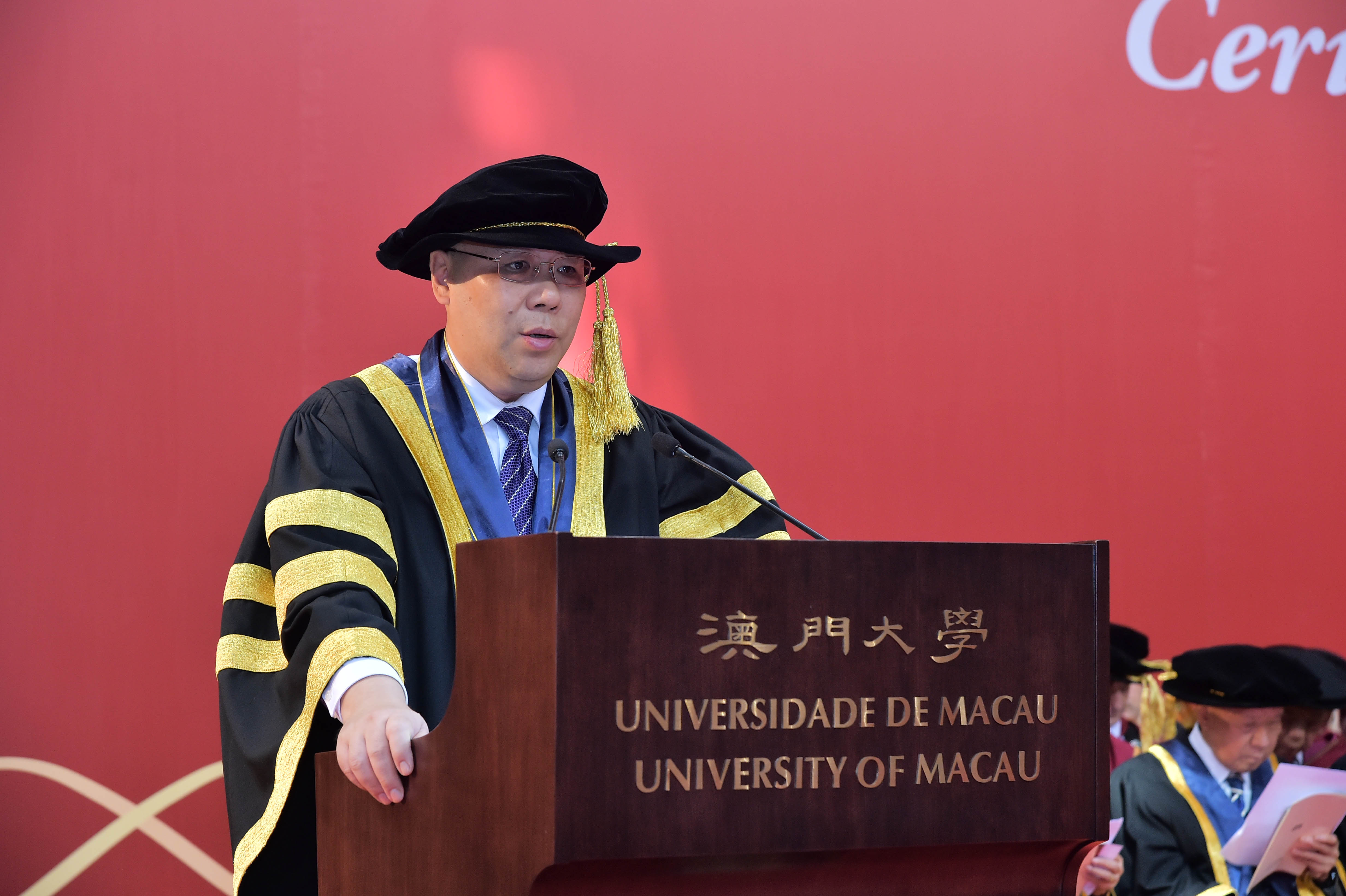 Chui officiated at the ceremony in the company of Secretary for Social Affairs and Culture Tam Chon Weng, UM University Council Chair Lam Kam Seng, UM Rector Wei Zhao, and Vice Rectors Lionel Ni, Rui Martins, and Haydn Chen. Nearly 4,000 people attended the ceremony, including members of the University Assembly, University Council, and Senate; government officials; prominent community members; parents of the graduates; and UM faculty and staff.