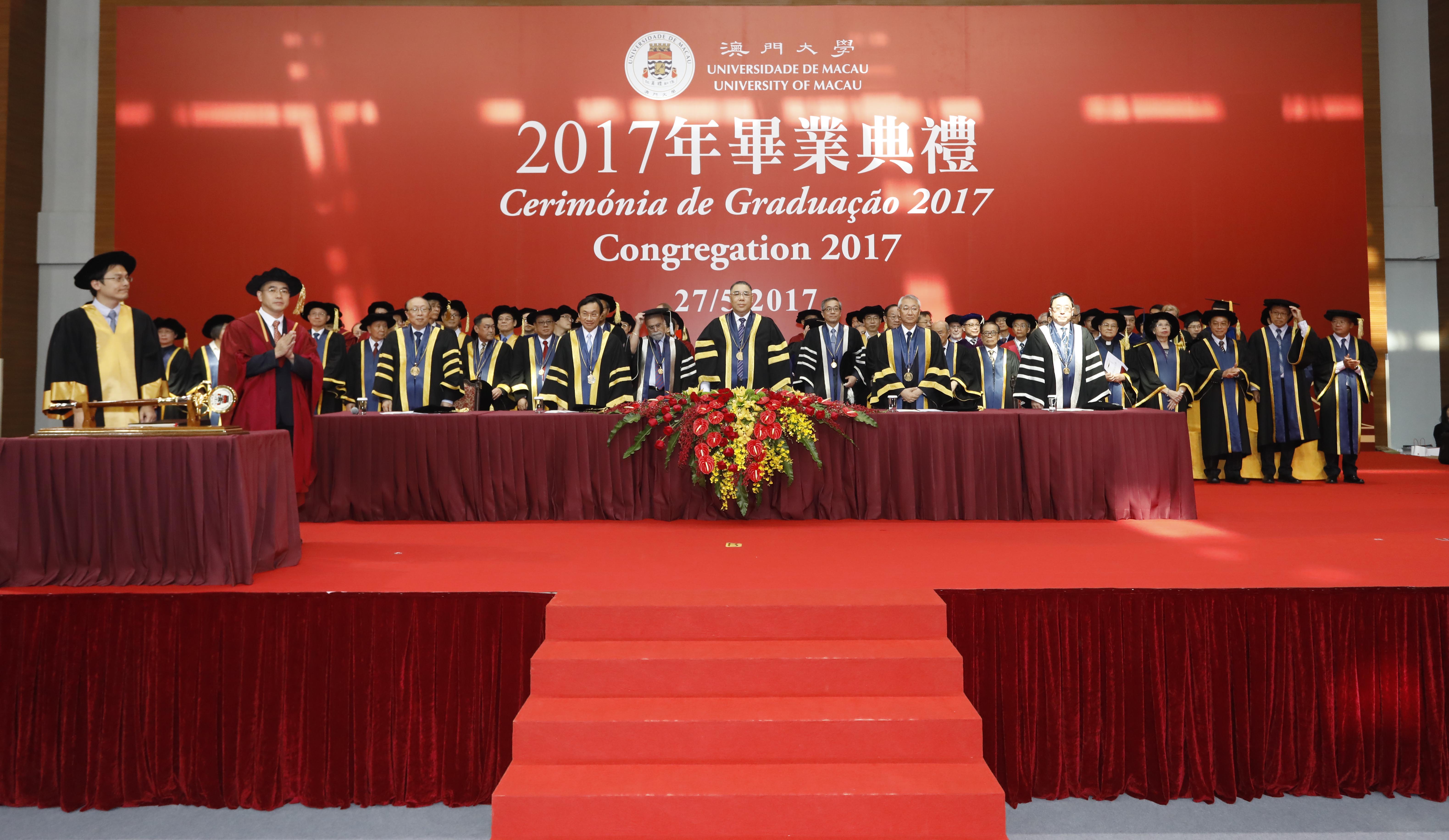 The University of Macau today (27 May) held the Congregation 2017. UM this year graduated 1,400 students. Chui Sai On, chief executive of Macao SAR and chancellor of UM, attended the ceremony. Chui said at the ceremony that today’s UM attaches importance to introducing high-calibre talent and actively joins the international higher education trend, adding that the university vigorously develops disciplines with potential and spares no effort in curriculum development in order to improve the quality of its education.