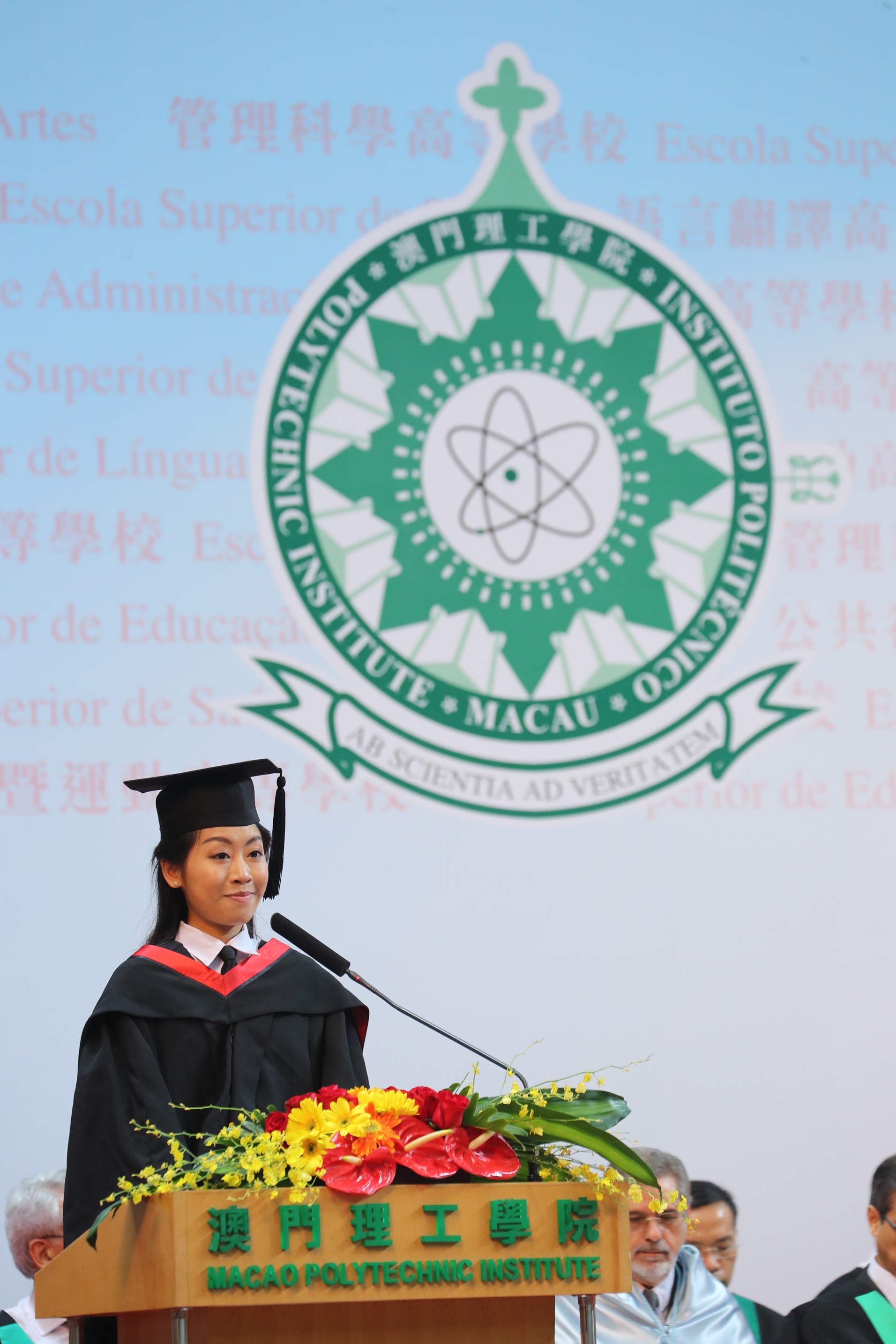 The graduation ceremony was formally held at the MPI Sports Pavillion on the afternoon of 19 June. It was officiated by the Chief Executive Dr. Chui Sai On, who was joined by Mr. Tam Chon Weng, Secretary for Social Affairs and Culture, and Professor Lei Heong Iok, President of MPI. Other distinguished guests also attended the ceremony included Mr Pu Hailong, representing the Liaison Office of the Central People's Government in the Macao SAR, members of the Legislative Council, members of MPI's Advisory Committee, other government officials, social elites and dignitaries, principals of secondary schools, parents and MPI faculty and staff. The guests were overjoyed to witness this exciting graduation ceremony and to share the joys with all graduates.