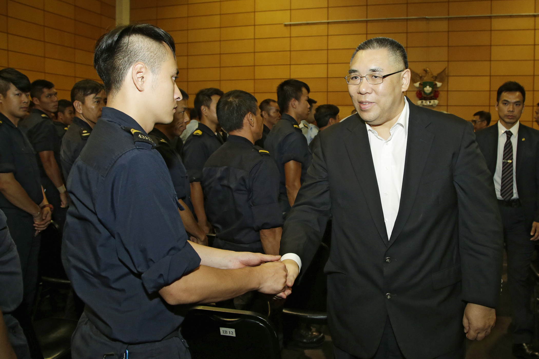 After a meeting at the Fire Services Bureau, Mr Chui had lunch with fire officers who took part in relief effort. The Secretary for Security, Mr Wong Sio Chak; the Commissioner-General of the Unitary Police Service, Mr Ma Io Kun; and the Director-General of the Macao Customs Service, Mr Vong Iao Lek, also joined the lunch.