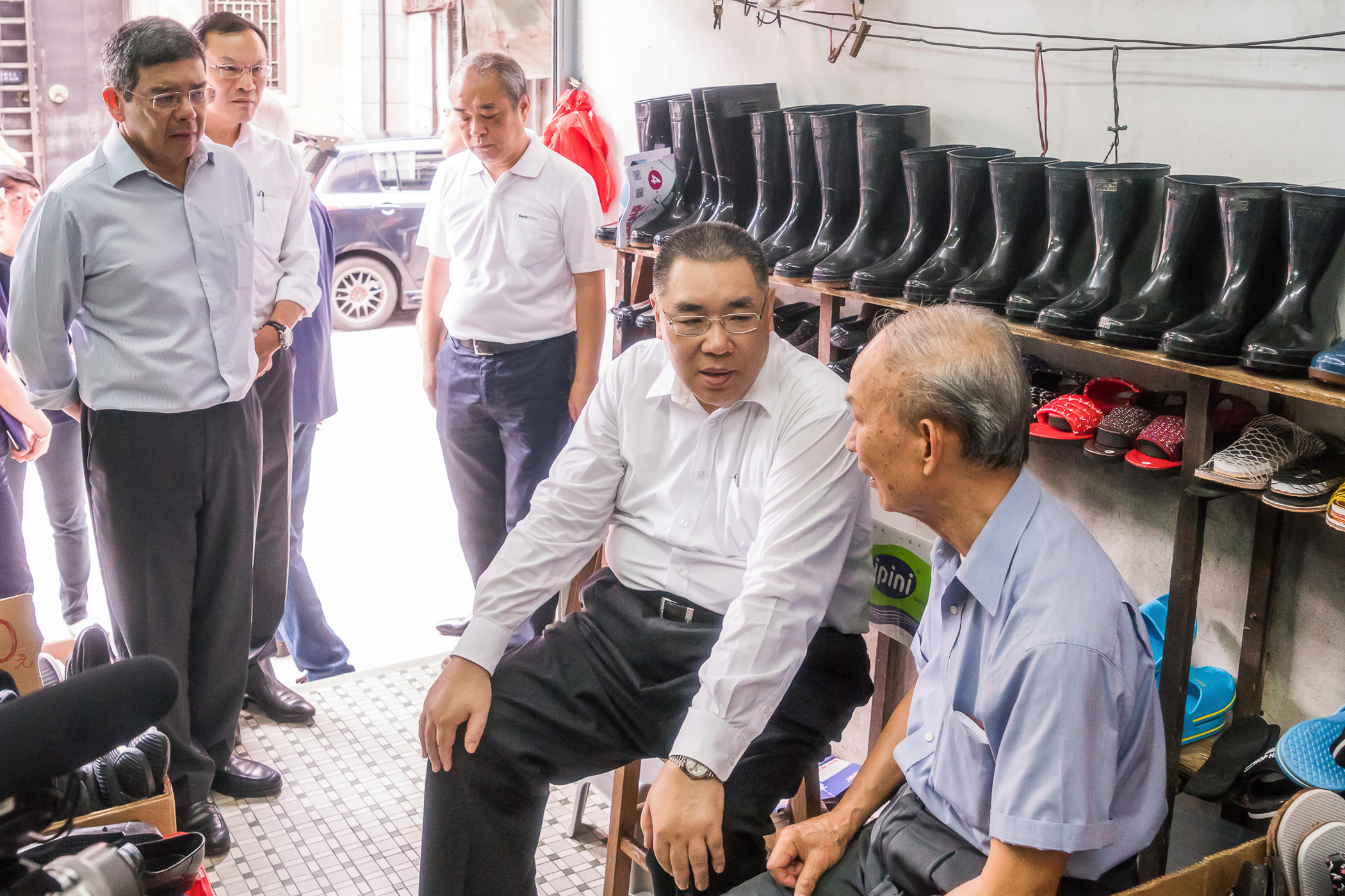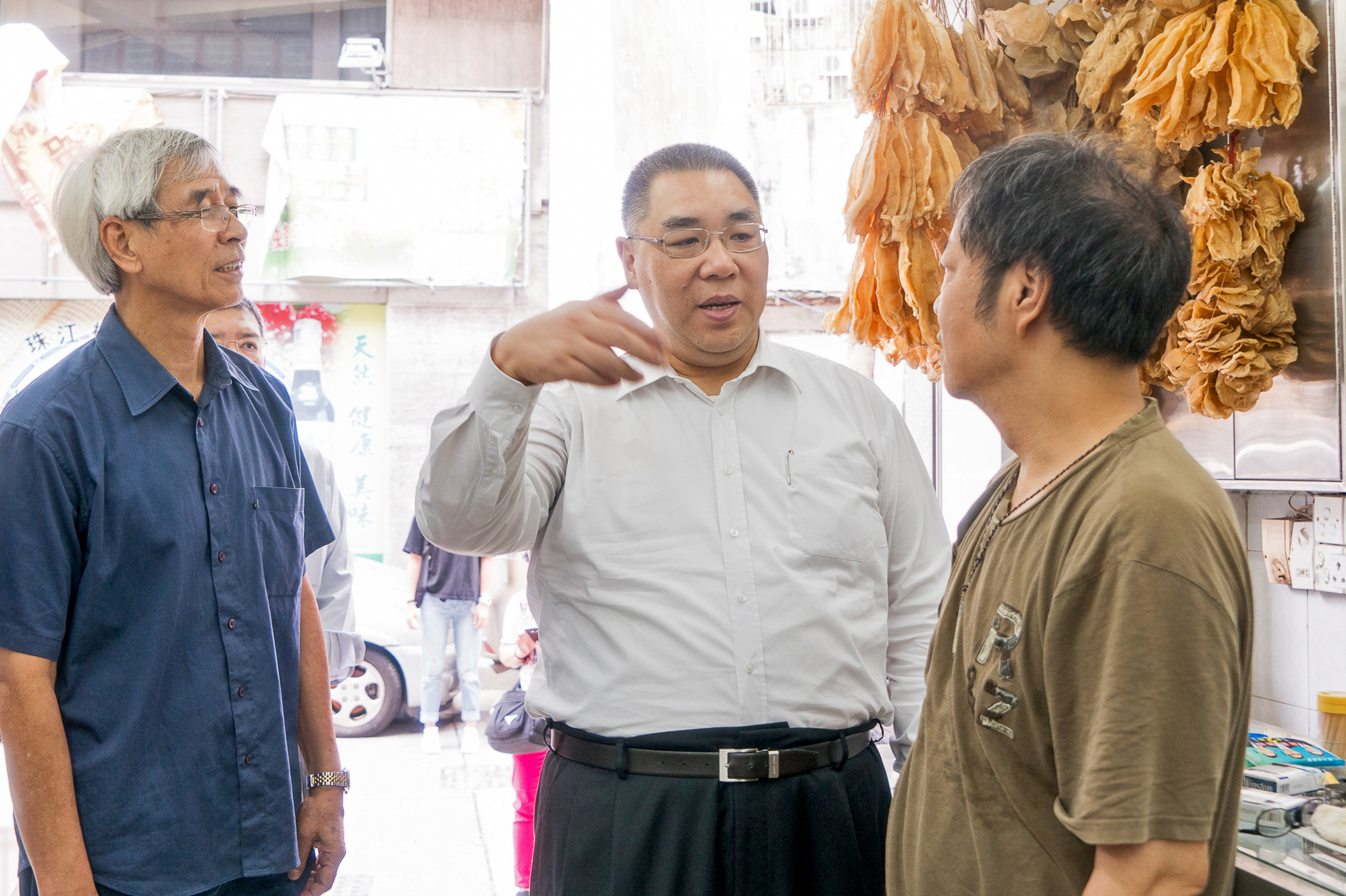 During this morning’s visit, Mr Chui talked to shopkeepers at dried seafood stores, tea sellers, record shops, shoe shops and purveyors of Chinese medicine, in order to gain an understanding of trading conditions in the aftermath of Typhoon Hato and to hear retailers’ suggestions for dealing with flooding issues at the Inner Harbour area.