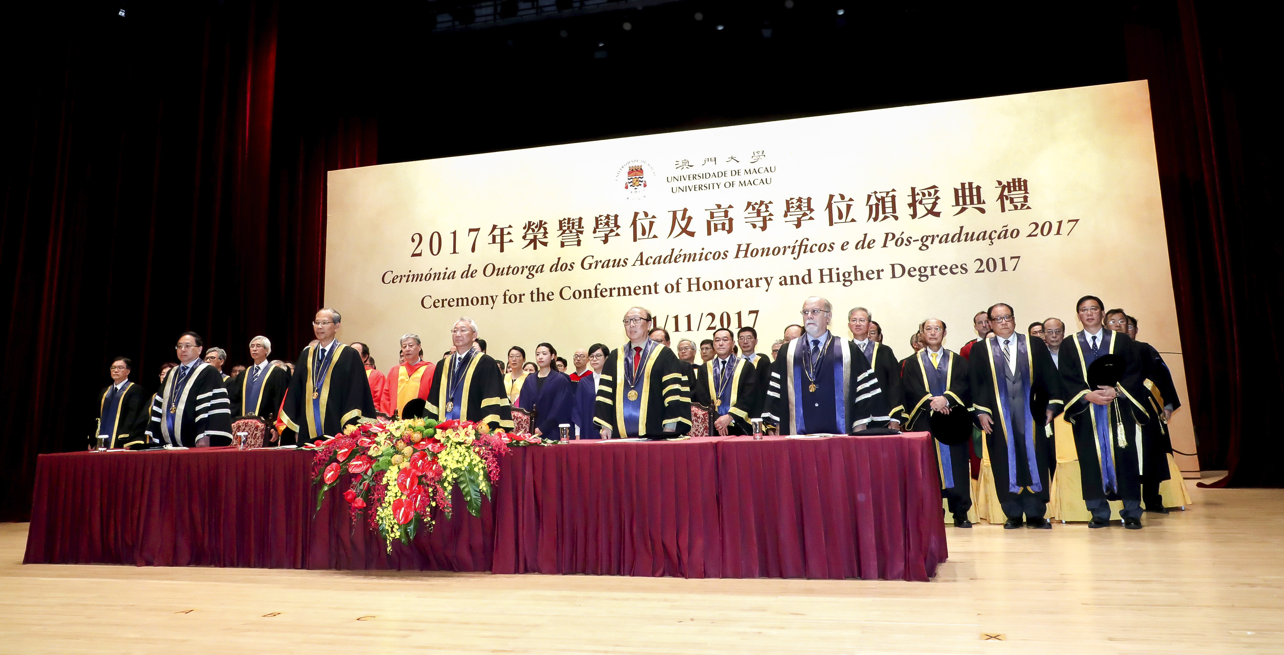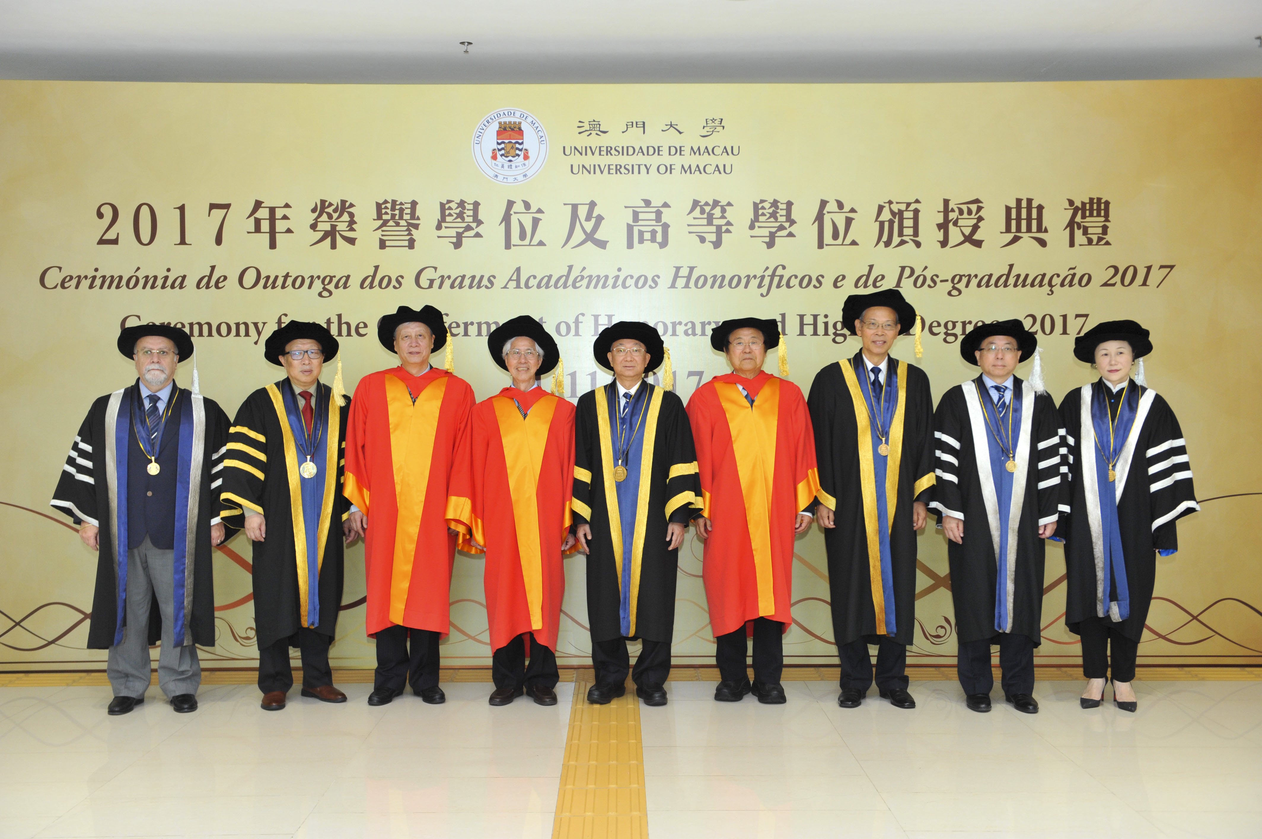 The University of Macau (UM) today (11 November) held the Ceremony for the Conferment of Honorary and Higher Degrees 2017. During the ceremony, the university conferred honorary doctorates on Academician He Jingtang, a representative figure in the Chinese school of architecture; Professor Henry T. Yang, a world-renowned expert in structural engineering; and Professor Binglin Zhong, a well-known educationalist, in recognition of their outstanding achievements and significant contributions to society and education.