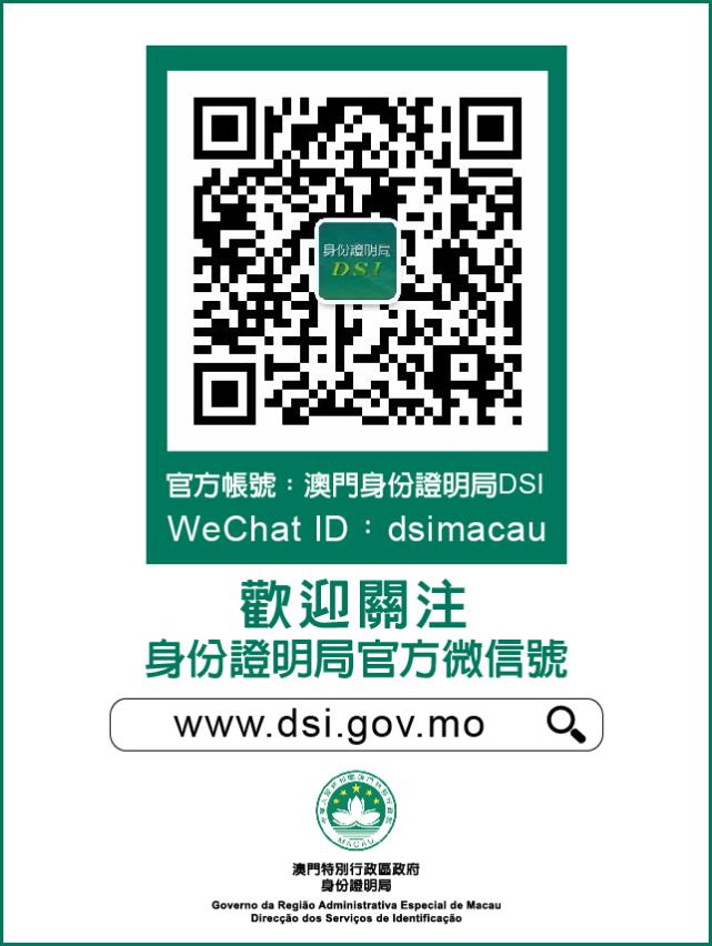 Citizens are welcome to follow the news published by DSI by searching “澳門身份證明局DSI” or “dsimacau” in WeChat or by scanning the following QR code with their mobile devices.