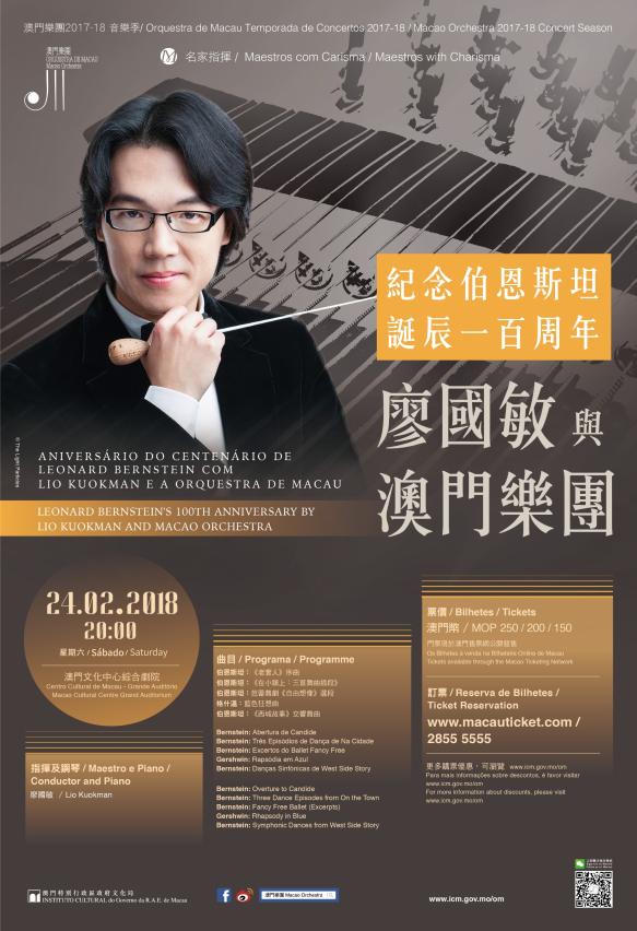 In order to mark the 100th anniversary of North-American composer Leonard Bernstein, the Macao Orchestra (OM, from the Portuguese acronym), under the auspices of the Cultural Affairs Bureau, presents the concert “Leonard Bernstein’s 100th Anniversary by Lio Kuokman and the Macao Orchestra” on 24 February, at 8pm, at the Macao Cultural Centre Grand Auditorium. Led by Lio Kuokman, a renowned musician hailing from Macao, the concert offers a programme dedicated to Leonard Bernstein. Lio Kuokman also takes on the role of pianist and reveals his great talent in a solo performance of Gershwin’s Rhapsody in Blue. In conjunction with the theme of this concert season “Along with the musical joy”, the Orchestra specially organizes the activity “Music Hour with Lio Kuokman”, on 23 February, at 7pm, at the Macao Cultural Centre Conference Room. Admission is free and reservations are available through tel. no. 2853 0782 during office hours.