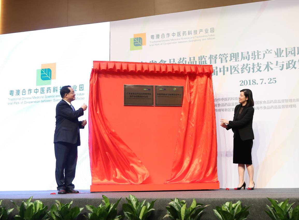 The plaque unveiling ceremony was officiated by Luo Wenzhi, Director of Guangdong Food and Drug Administration and Adviser to the Office of the Secretary for Economy and Finance of the Government of the Macao Special Administrative Region, President Lu Hong of the Guangdong-Macao Traditional Chinese Medicine Technology Industrial Park Development Co., Ltd. The two guests represented both parties as they unveiled the plaque. Furthermore, the ceremony was witnessed by Leong Vai Tac, Secretary for Economy and Finance of the Government of the Macao Special Administrative Region; Yan Wu, Vice Mayor of Zhuhai; Niu Jing, Secretary of CPC Hengqin New Area Committee; Kuok Cheong U, Deputy Director of the Health Bureau of the Government of the Macao Special Administrative Region; and Zong Yungang, Deputy Director of the CFDA Southern Medicine Economic Research Institute of the State Food and Drug Administration.