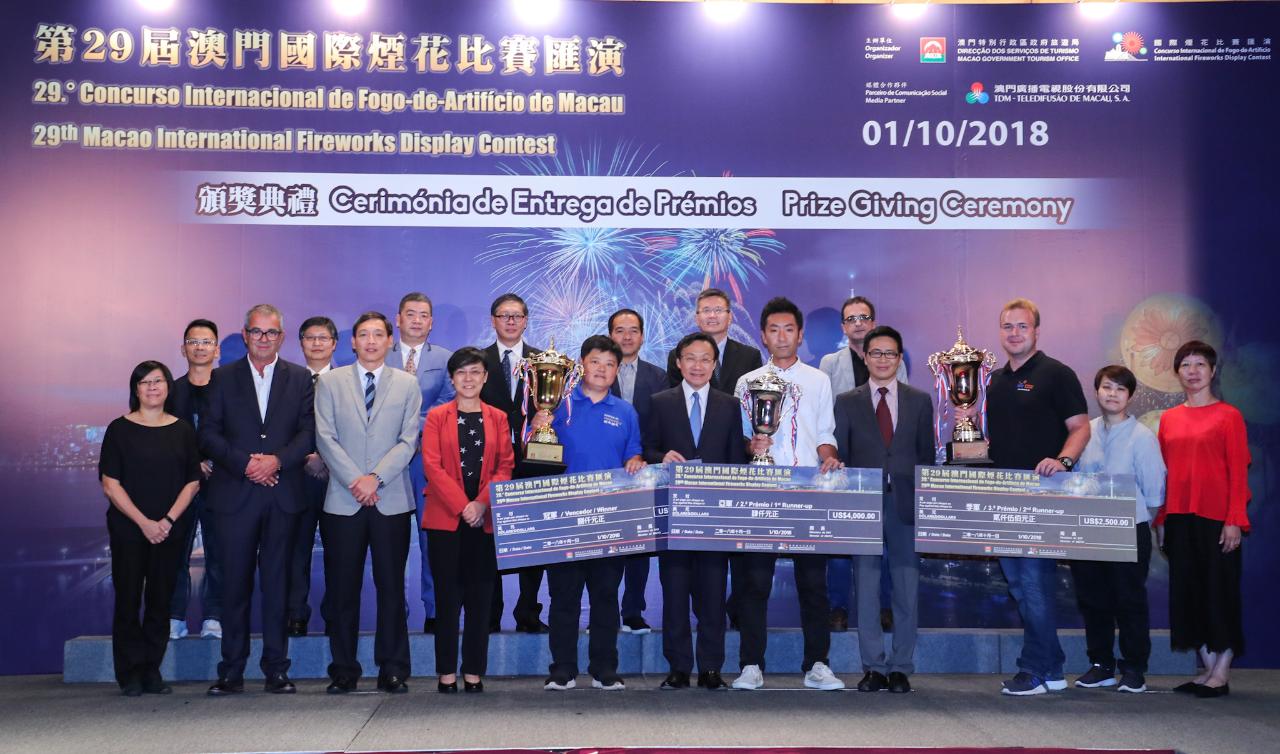 The 29th Macao International Fireworks Display Contest culminated in splendour tonight (1 October), the National Day. Liuyang New Year Fireworks Trading Co., Ltd from China won the championship, followed by the fireworks teams Marutamaya Ogatsu Fireworks Co., Ltd. from Japan and Potsdamer Feuerwerk GmbH from Germany as the first and second runners-up.