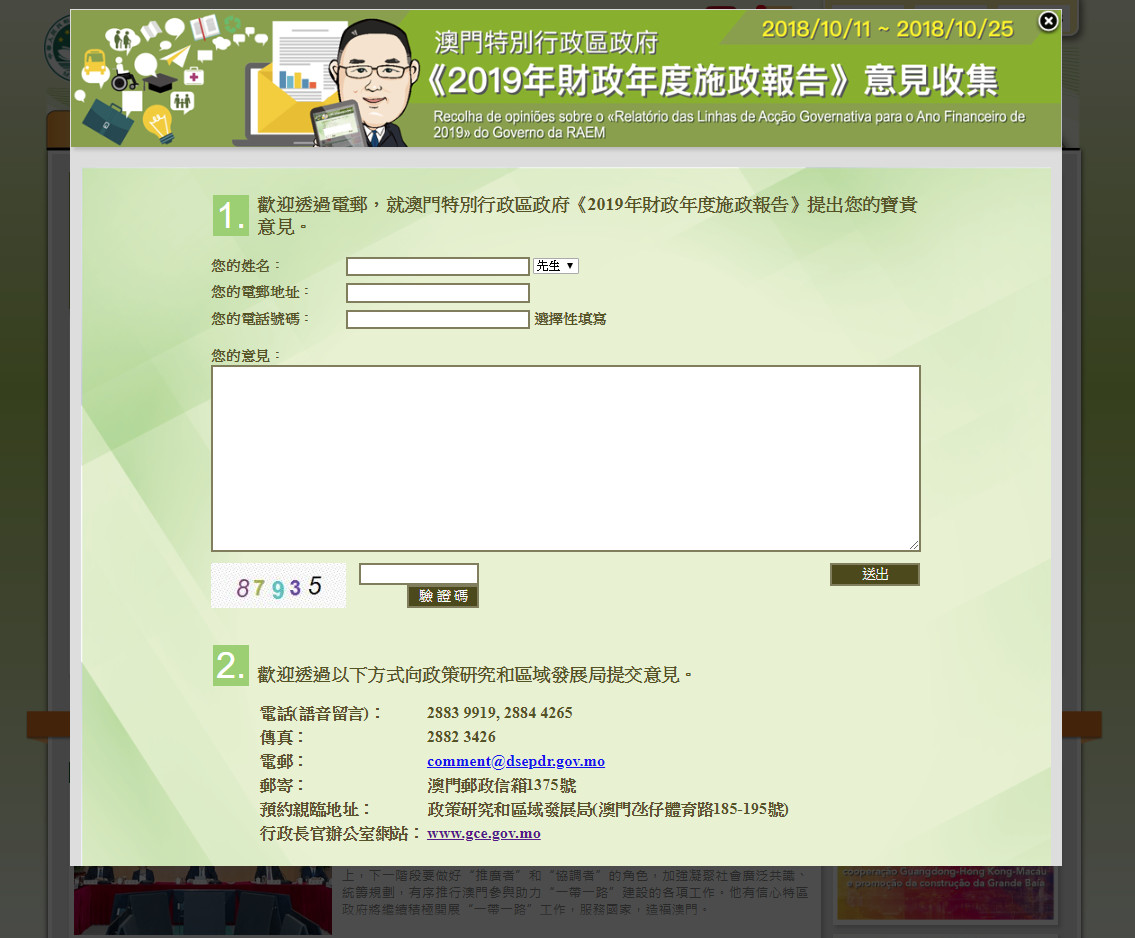 Members of the public are welcome to contribute their opinions either via the official website of the Chief Executive’s Office (www.gce.gov.mo) or via the mobile application “GCE Macao”. Alternatively, opinions can be sent to the Policy Research and Regional Development Bureau, via any of the following methods: by telephone on either +853 2883 9919 or +853 2884 4265; by fax on +853 2882 3426; by email at comment@dsepdr.gov.mo; by post to P.O. Box 1375; or in person (by prior appointment only) to representatives of the Policy Research and Regional Development Bureau at Rua do Desporto, No.185-195, Taipa, Macao.