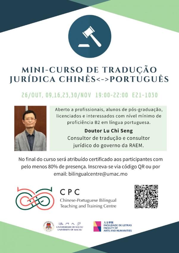 The workshop will be conducted in Portuguese on Friday evenings from 7:00pm to 10:00pm at the Faculty of Arts and Humanities (E21-1030). A minimum level of B2 Portuguese language proficiency, according to the Common European Framework of Reference for Languages (CEFR), is required to attend this course. For more information and application, please visit the webpage of the Department of Portuguese:https://fah.umac.mo/portuguese/fah-dport-portuguese-chinese-legal-translation-workshop-中葡法律翻譯工作坊/. The deadline for applications is 23 October.