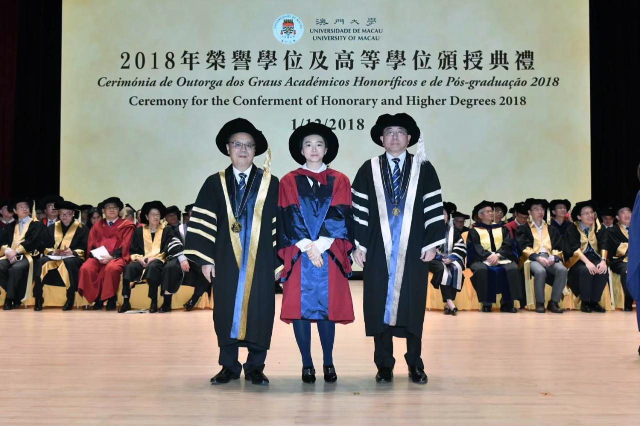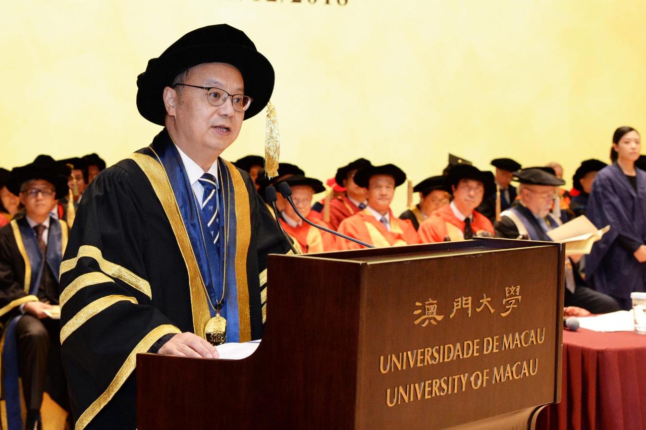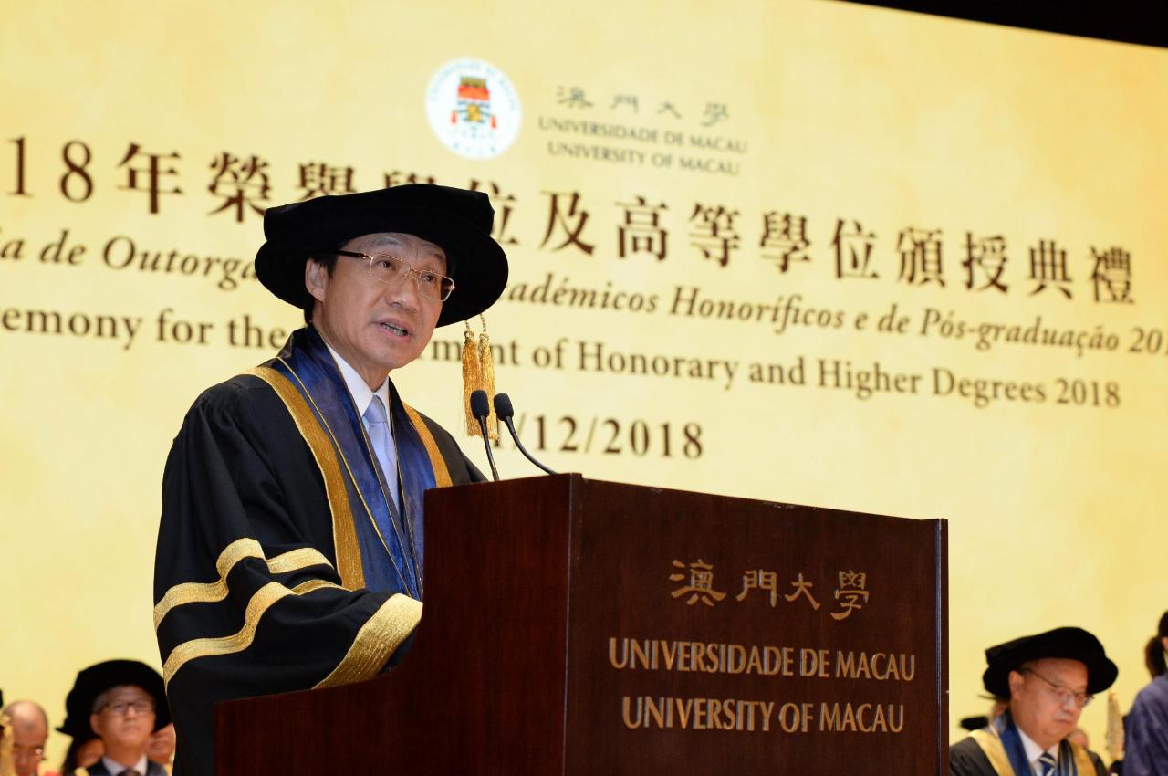 The University of Macau (UM) today (1 December) held the Ceremony for the Conferment of Honorary and Higher Degrees 2018. This year, more than 800 students from PhD degree programmes, master’s degree programmes, and postgraduate diploma/certificate programmes received graduation certificates. At the ceremony, Secretary for Social Affairs and Culture of the Macao SAR Tam Chon Weng, acting as the representative of the Macao SAR Chief Executive and UM Chancellor Chui Sai On, said that the Macao SAR government will continue to support the university’s development. He encouraged the graduates to play an active part in the development of the Greater Bay Area and create their own success stories.