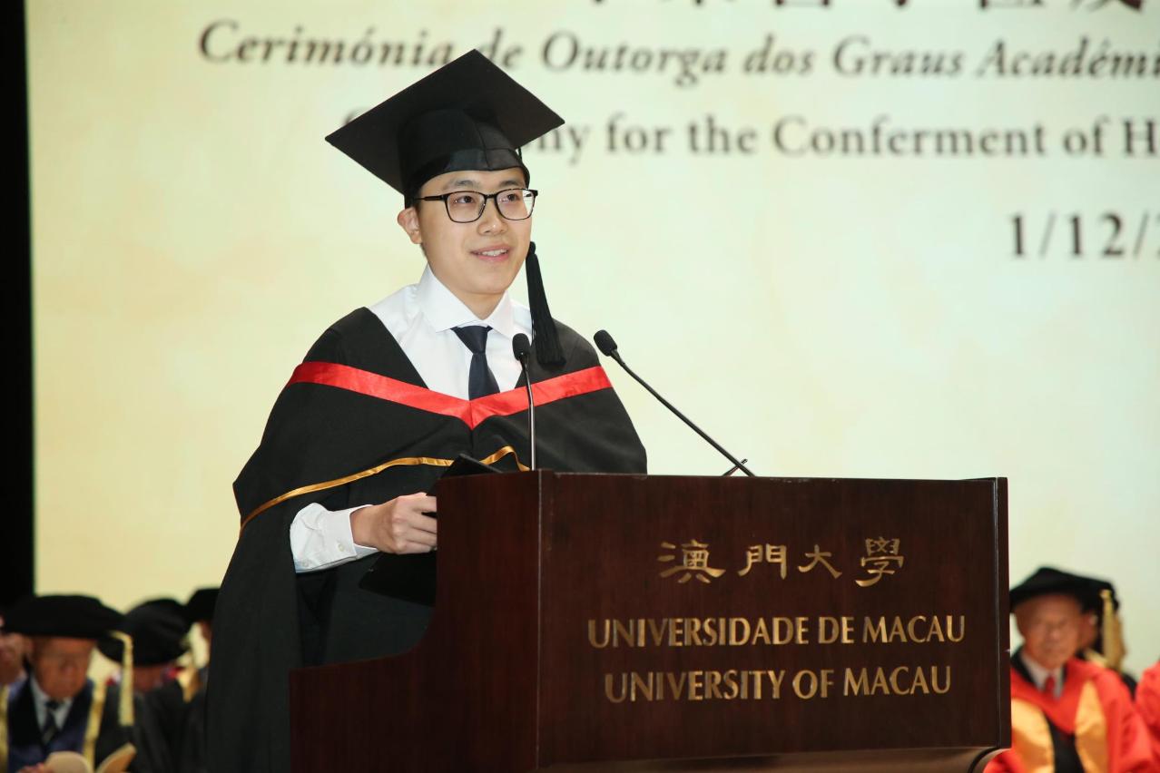 Wang Jiteng, representative of the graduates, delivered a speech to thank the professors and family members, especially parents, for their support. He said, ‘I never thought that I had the ability to organise international academic activities. In two years, my team and I organised exchange programmes and paid regular academic visits to Peking University, Waseda University, and the National University of Singapore.’ He added, ‘UM helps me to get out of my comfort zone and share my thoughts. In our free time, we are also encouraged to serve the community. Through my experiences as a volunteer, UM enriched my life and taught me that a well-rounded person not only has academic success but also undertakes social responsibility. UM helps its students become global citizens that actively undertake social responsibility and contribute to the community.’