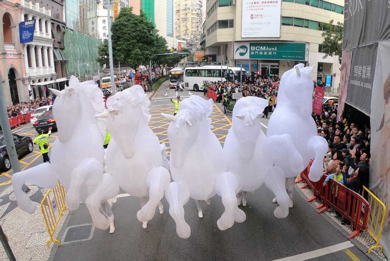 Organized by the Cultural Affairs Bureau (IC, from the Portuguese acronym), the “2018 Macao International Parade”, celebrating the 19th Anniversary of Macao’s handover to China, was held on Sunday, 16 December. Based on the concept of cultural encounter between China and Portuguese-speaking countries, over 1700 participants paraded from the Ruins of St. Paul’s to the Sai Van Lake Square, dancing along the way and offering spectacular and charming large art installations. All residents and tourists enjoyed in this feast of “Love, Peace and Cultural Integration”, celebrating the handover together.