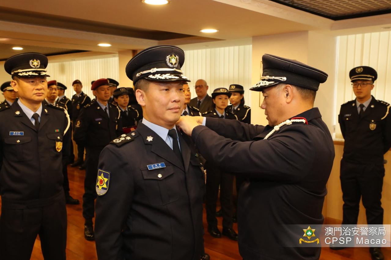 Six senior police officers, Ku Keng Hin, Ku I Kan, Tong Chi Meng, Lei Chong Man, Lao Sio Leng and Chio Song Un, were promoted to the rank of Assistant Commissioner. Upon completion of the Senior Police Officer Training Programme at the Academy of Public Security Forces, they were promoted to Chief Inspector and served as officers-in-charge of various departments. With expertise and substantial work experience, the six senior police officers had outstanding performance and were promoted and awarded commendations several times. They were the Acting Head of the Resource Management Department of the Public Security Police Force, the Advisor of Office to the Secretary for Security, the Division Chief of the Police Affairs Liaison and Public Relations Division of the Unitary Police Service, the Acting Head of the Traffic Department of the Public Security Police Force, the Acting Head of the Land Checkpoint Management Department of the Public Security Forces Affairs Bureau and the Acting Commander of the Tactical Police Unit of the Public Security Police Force respectively prior to this promotion.