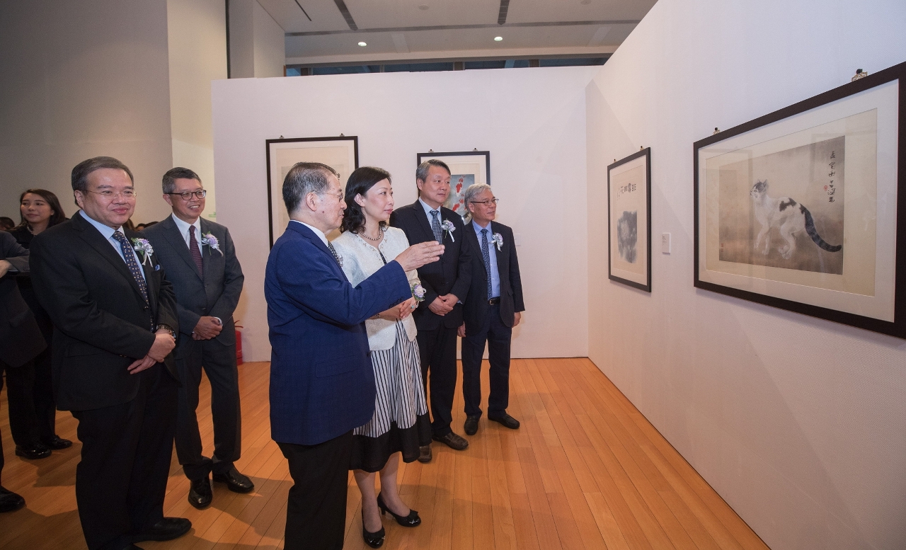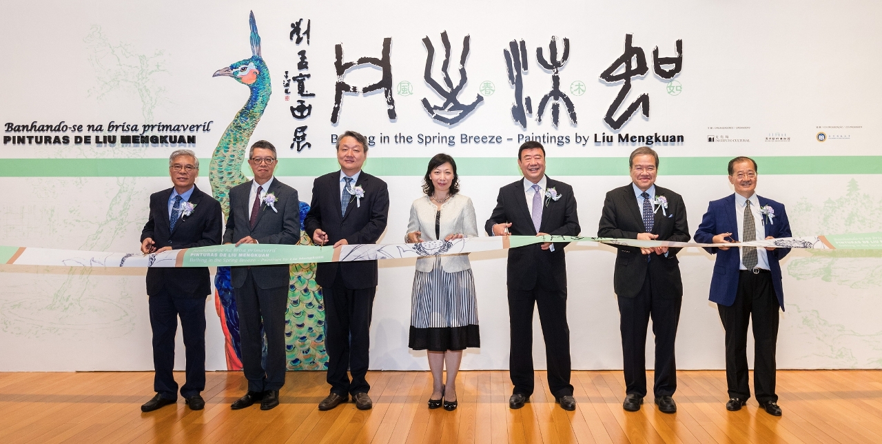 The exhibition “Bathing in the Spring Breeze – Paintings by Liu Mengkuan”, organized by the Macao Museum of Art (MAM), under the auspices of the Cultural Affairs Bureau, was inaugurated on 26 July, at 6:30pm, at the Special Exhibition Gallery of the Handover Gifts Museum of Macao. The opening ceremony was held in a lively atmosphere and was officiated by the President of the Cultural Affairs Bureau, Mok Ian Ian; the Assistant of the Deputy Director of the Department of Publicity and Culture of the Liaison Office of the Central People's Government in the Macao S.A.R., Shao Bin; the Chancellor of the Macau University of Science and Technology, Liu Chak Wan; the Chairman of The Wharf (Holdings) Limited, Stephen Ng; the Chairman of the Healthy China Medical and Pharmaceutical Foundation Limited, Anthony Wu; the Executive Vice President of the Yu Un Chinese Calligraphers and Painters Association of Macao, Sio Chun Iun; and the artist Liu Mengkuan. During the opening ceremony, the President of the Cultural Affairs Bureau presented the certificate of appreciation to the artist Liu Mengkuan for his donation of work entitled Roaster on the Rock to the Macao Museum of Art of the Cultural Affairs Bureau.