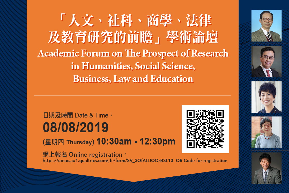 The forum will start at 10:30am in the Auditorium, Cultural Building (E43), UM. It will be conducted in English. Those who are interested please register at https://umac.au1.qualtrics.com/ jfe/ form/ SV_3OfAtLIOQrB3L13. For enquiry, please call 8822 8520.