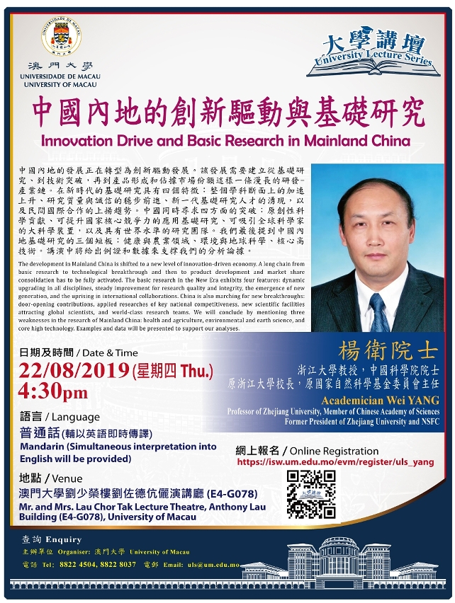 The University of Macau (UM) on 22 August (next Thursday) will hold a lecture on innovation-driven development and basic research in mainland China, as part of the University Lecture Series. Yang Wei, a renowned expert in mechanics, will be the keynote speaker. Yang will discuss the driving force behind innovation in mainland China, its characteristics, and the path forward. All are welcome.