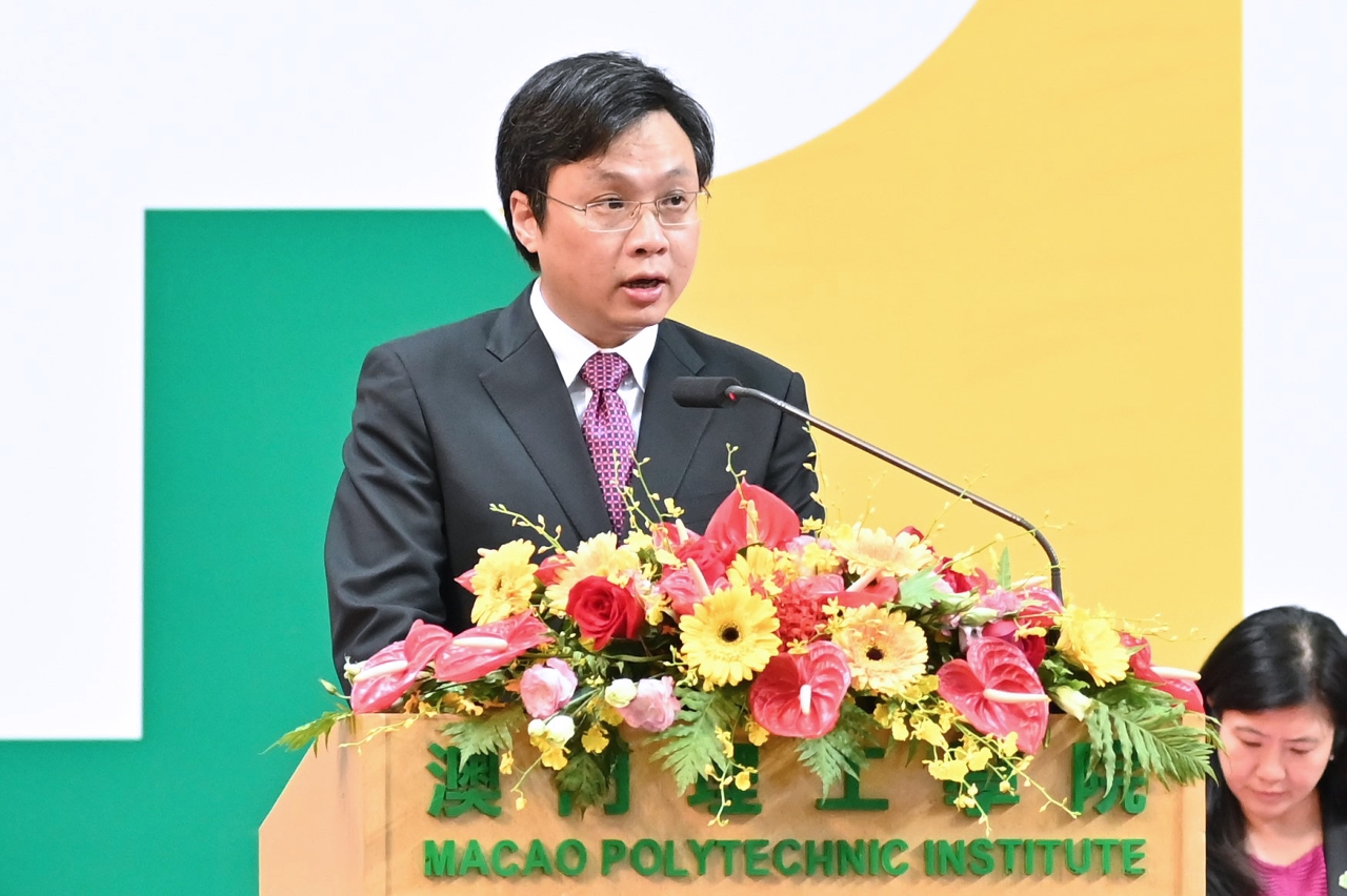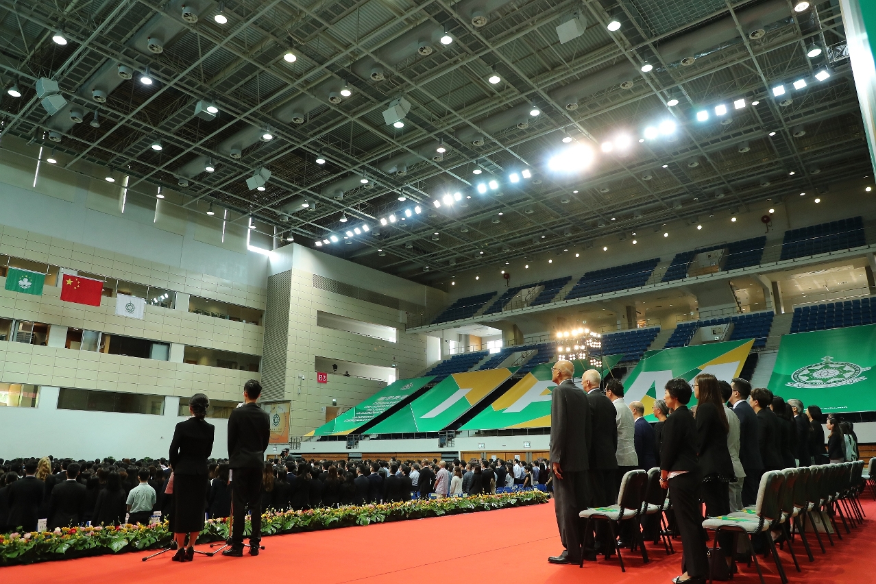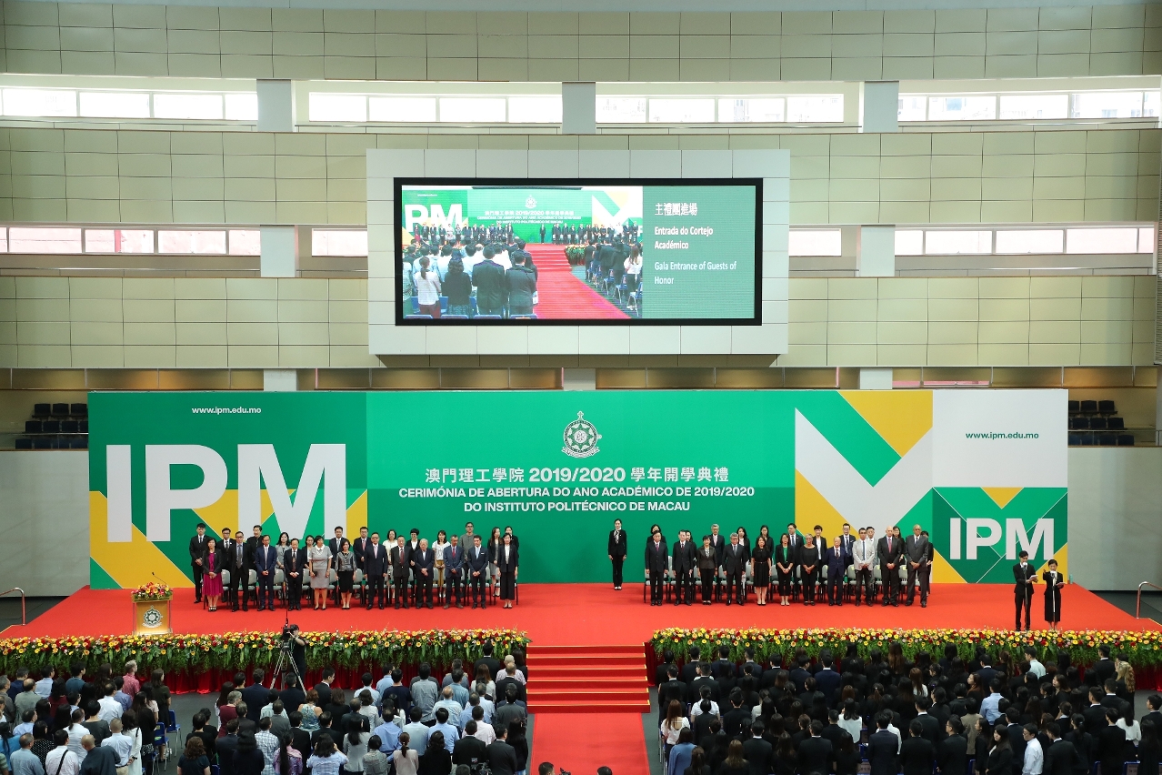 Macao Polytechnic Institute held the opening ceremony for academic year 2019/2020 in MPI Multi-sport Pavilion on 20 August at 3:00 p.m. The ceremony carried forward the tradition of loving the country and Macao by hoisting the national flag and playing and singing the national anthem. This academic year, MPI inducted 1000 freshmen of Bachelor’s Degree programmes, Master’s Degree programmes and Ph.D. programmes, from Macao and other parts of the Greater Bay Area and from Portuguese-speaking countries; and more than 500 excellent students were awarded scholarships at the ceremony. Over 2000 participants, including community leaders, representatives of scholarship sponsors, representatives from universities at home and abroad, and MPI staff and students, attended the ceremony and stood as witnesses for the freshmen to be sworn into the MPI family with their oath of “MPI heart, our new start”, in a lively and touching atmosphere.