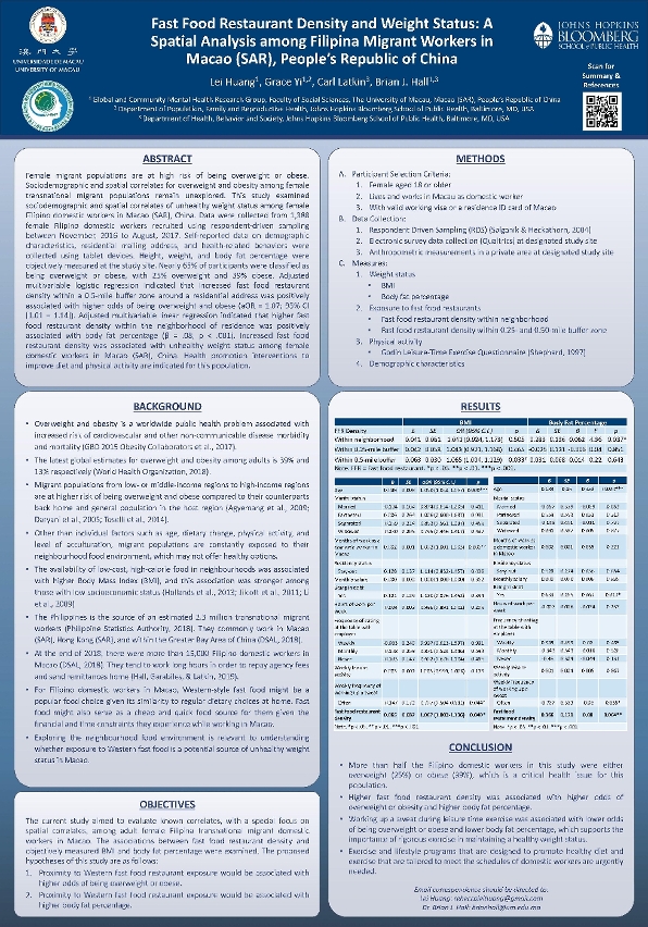 The winning paper is titled ‘Fast Food Restaurant Density and Weight Status: A Spatial Analysis among Filipina Migrant Workers in Macao (SAR), People’s Republic of China’. The study collected data from nearly 4,000 Filipina migrant workers in Macao, including the participants’ demographic characteristics, health-related behaviours, height, weight, and body fat percentage. The study has found that nearly 65 per cent of the participants are either overweight or obese and that the increased density of fast food restaurants has been associated with the unhealthy weight status of female migrant workers in Macao. The study suggests that health interventions to improve diet and physical activity should be promoted among this population.