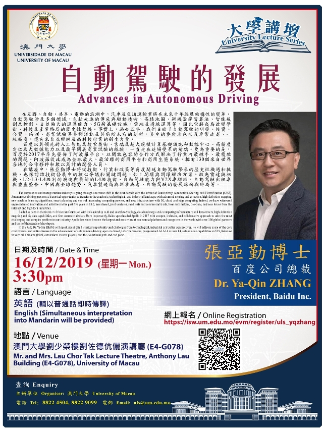 The University of Macau (UM) on 16 December (next Monday) will hold a lecture titled ‘Advances in Autonomous Driving’, as part of the University Lecture Series. Dr Zhang Yaqin, president of the Chinese internet giant Baidu, will be the keynote speaker. During the event, Zhang will talk about the opportunities and challenges brought by autonomous driving from technological, industrial, and policy perspectives.
