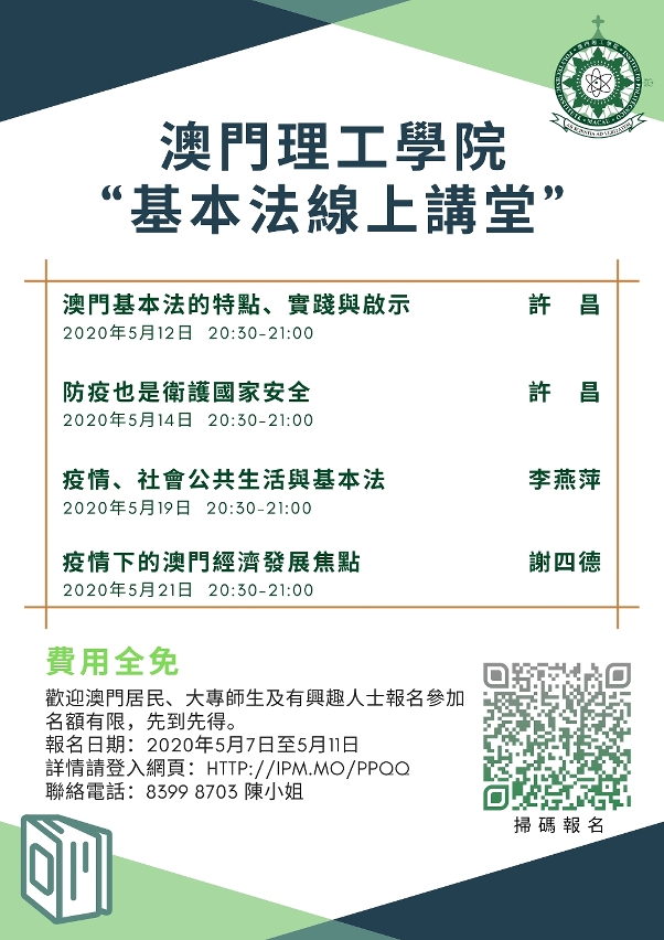 MPI’s "Basic Law Online Lecture" Series is now open for registration until 11 May 2020. Macao residents, college teachers and students, and interested parties are all welcome. The Series commences on 12th May for two consecutive weeks every Tuesday and Thursday at 8:30 pm. Registration is free with limited spaces and served on a first-come-first-served basis. Details and registration are available on the webpage: http://ipm.mo/ppqq. For inquiries, please contact Ms. Chan of the "One Country, Two Systems" Research Centre at 8399 8703.