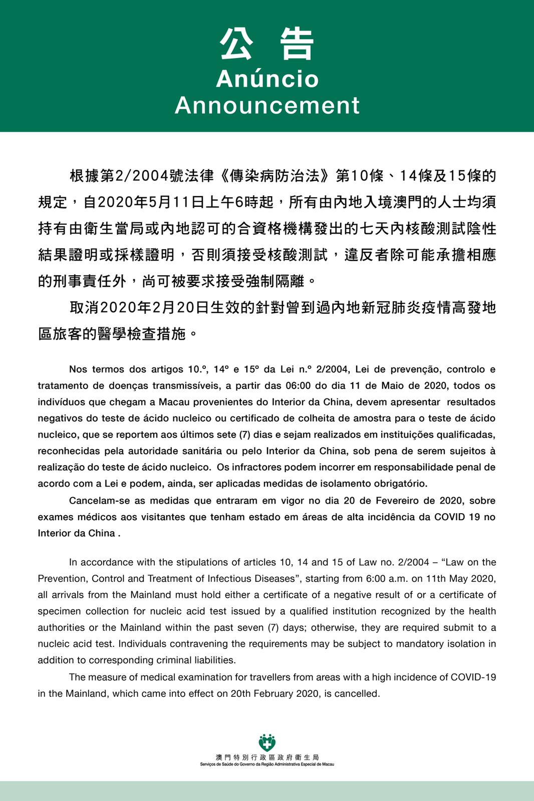 The measure took effect from 6am today. As outlined in Executive Order No 120/2020 published in the Macao SAR Gazette on Saturday (9 May), such persons must fulfil the following three requirements: