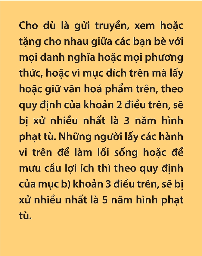 Cho dù là gửi truyền, xem hoặc tặng cho nhau giữa các bạn bè với mọi danh nghĩa hoặc mọi phương thức, hoặc vì mục đích trên mà lấyhoặcgiữ văn hoá phẩm trên, theo quy định của khoản 2 điều trên, sẽ bị xử nhiều nhất là 3 năm hình phạt tù. Những người lấycáchành vi trên để làm lối sống hoặc để mưu cầu lợi ích thì theo quy định của mục b) khoản 3điều trên, sẽ bị xử nhiều nhất là 5 năm hình phạt tù.