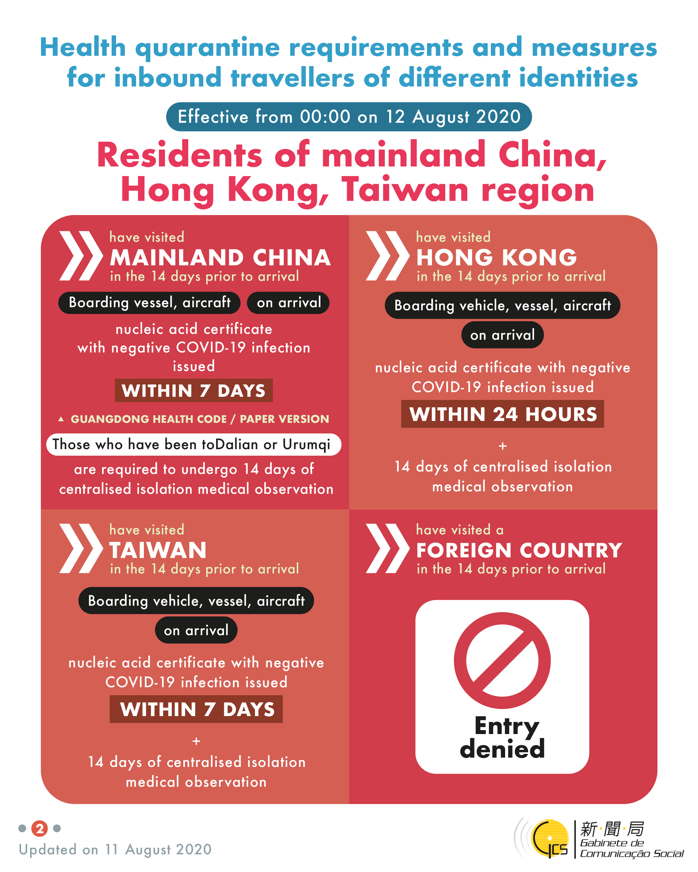 Health quarantine requirements and measures for inbound travellers of different identities, updated on 11 August 2020.