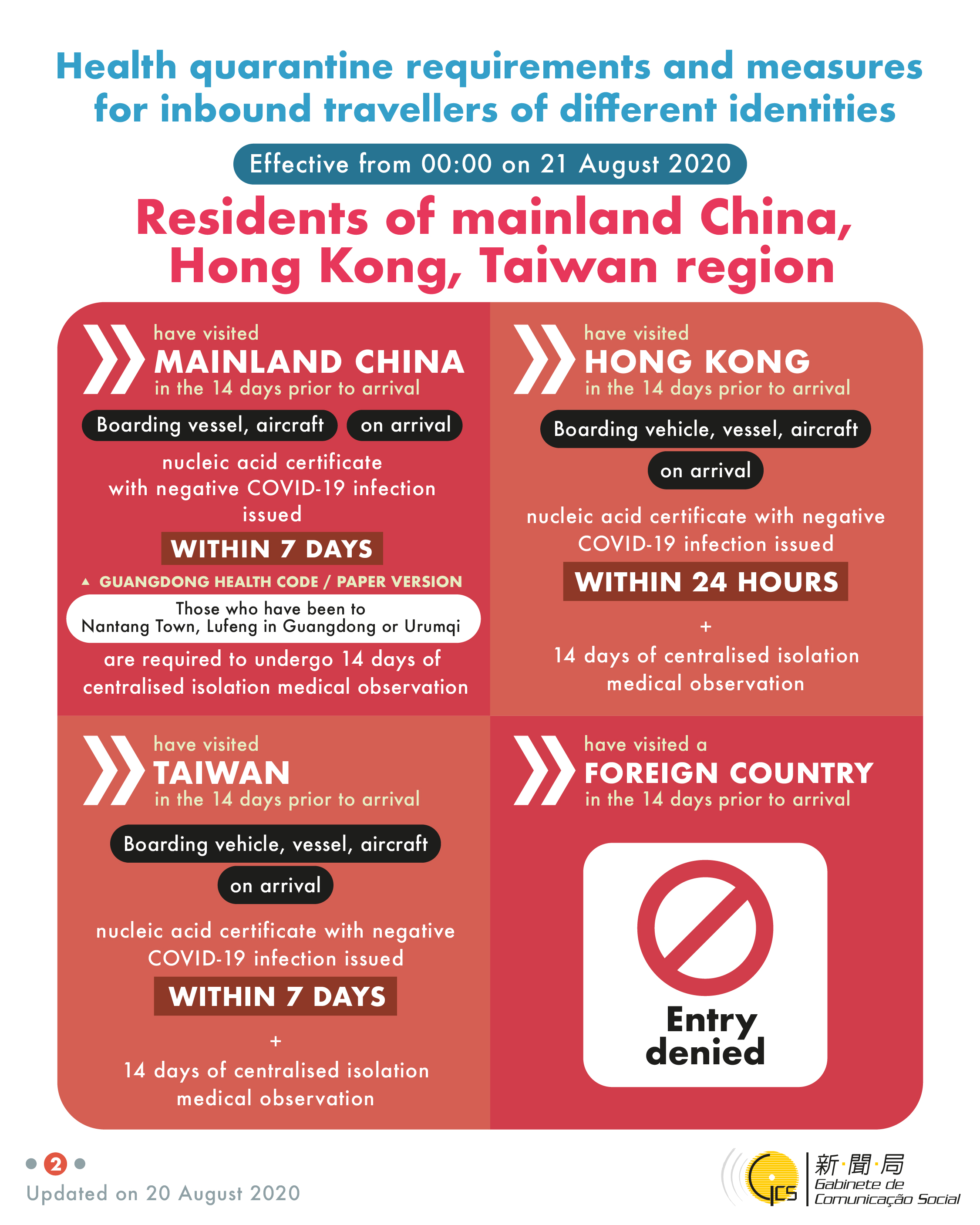 Health quarantine requirements and measures for inbound travellers of different identities, updated on 20 August 2020.