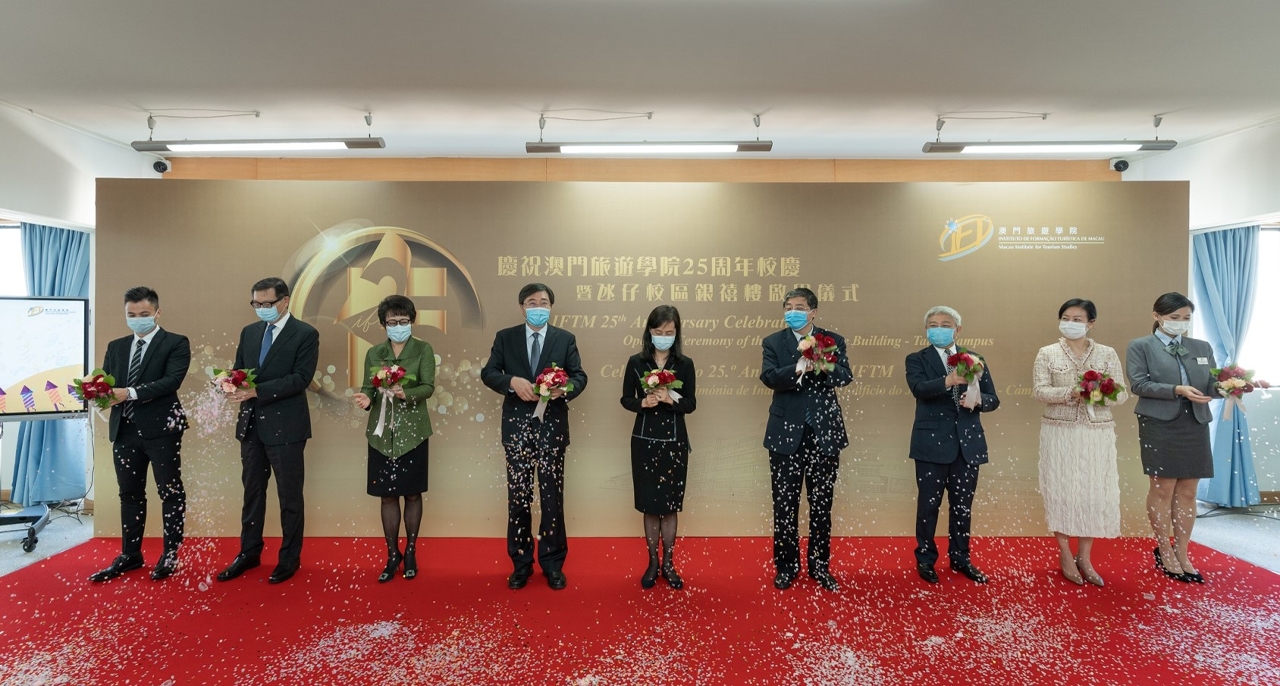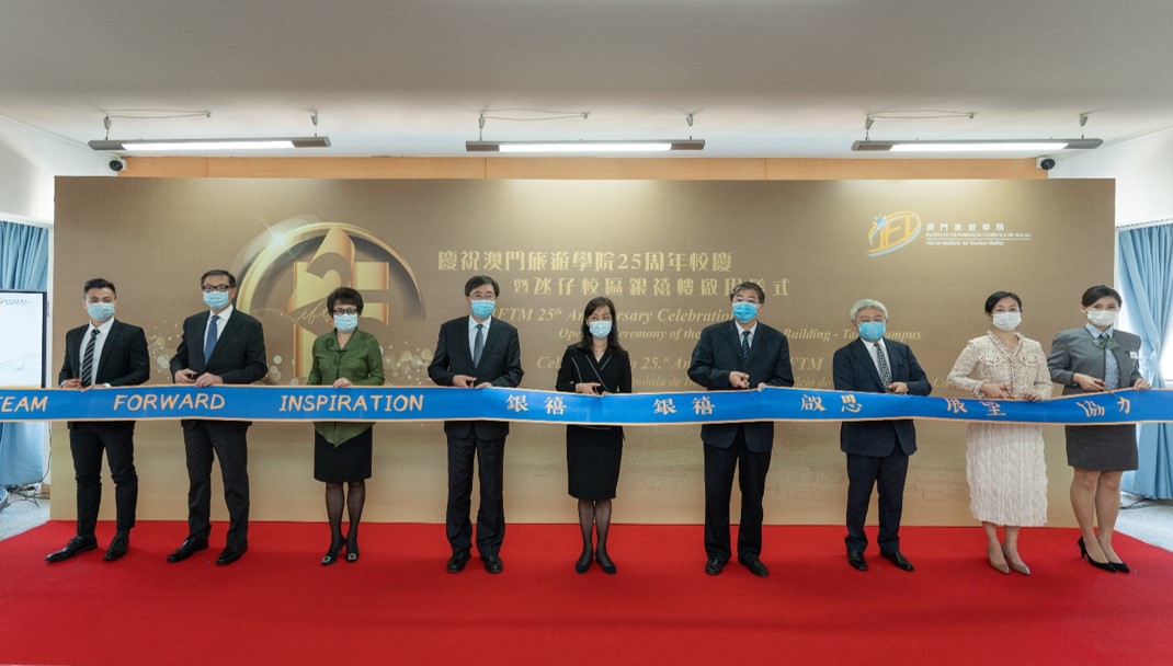 The Macao Institute for Tourism Studies (IFTM) celebrated its 25th anniversary and the Opening Ceremony of the Silver Jubilee Building in Taipa Campus today (5 November). The ceremony was officiated by Ms. Ao Ieong U, Secretary for Social Affairs and Culture, Mr. Zhang Xu, Vice-Minister of Culture and Tourism of the People’s Republic of China, Mr. Luo Yong Gang, Vice Director of the Liaison Office of the Central People’s Government in the Macao S.A.R., Ms. Wang Dong, Acting Commissioner, the Office of the Commissioner of the Ministry of Foreign Affairs of the People’s Republic of China in the Macao Special Administrative Region, Mr. Chan Chak Mo, Chairman of the IFTM Council, Mr. Francis Lui Yiu Tung, Vice-Chair of the IFTM Council, Dr. Fanny Vong, IFTM President, Mr. Armando Amante, President of the IFTM Alumni Association, and Student Representative Lao Hou Cheng. Representatives of government departments, colleges and universities, scholarship institutions and the industry, as well as faculty members, also attended this ceremony.