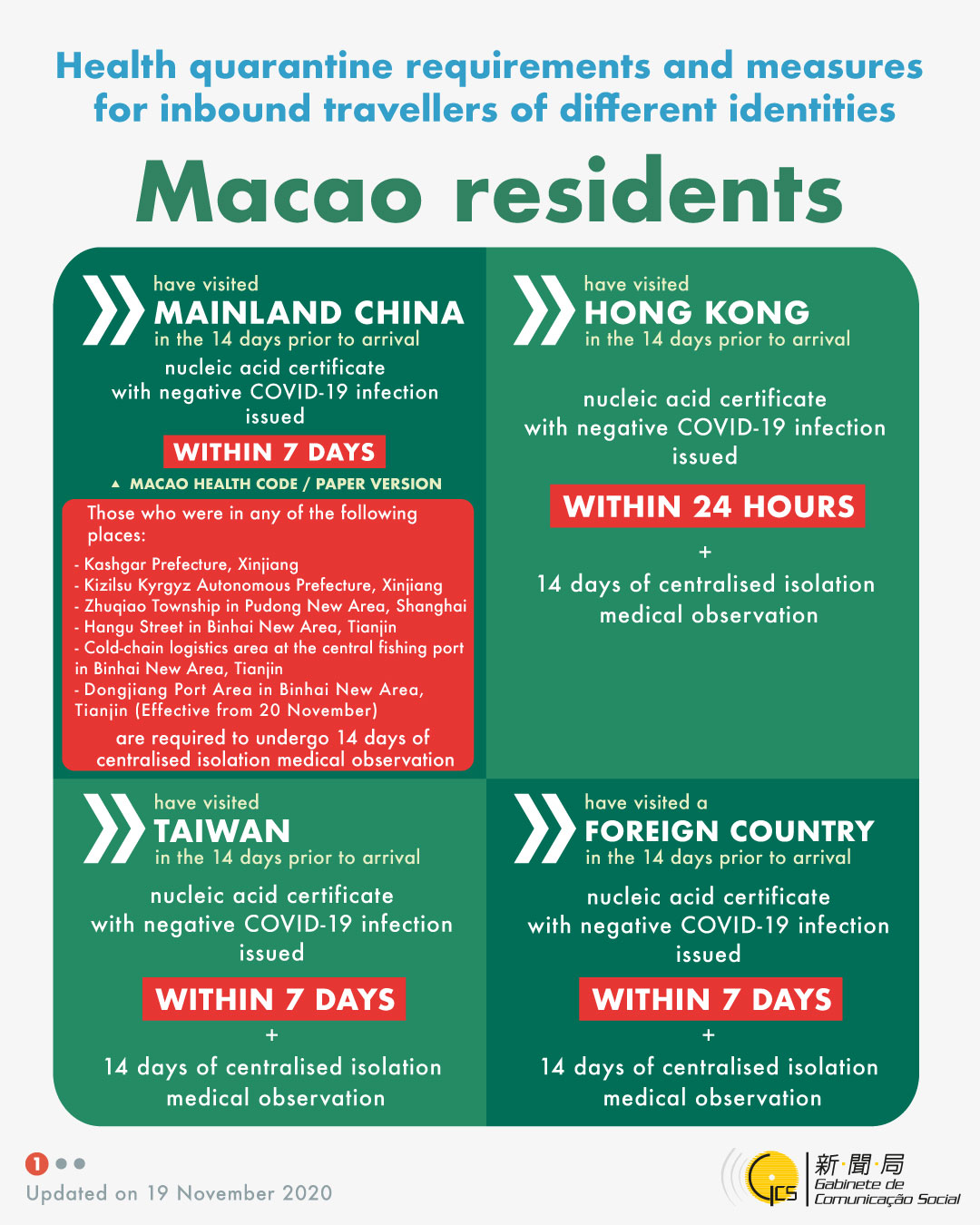 Health quarantine requirements and measures for inbound travellers of different identities, updated on 19 November 2020.