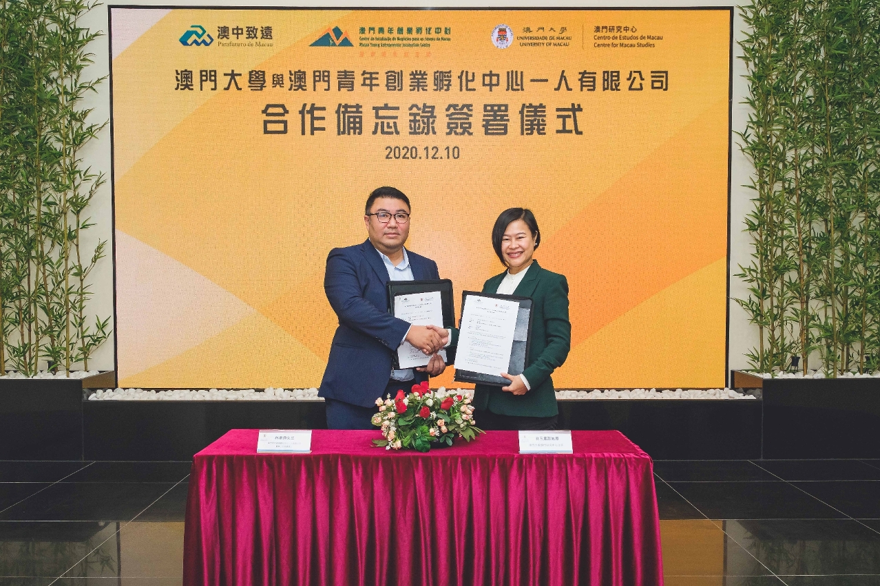 The University of Macau (UM) and the Macao Young Entrepreneur Incubation Centre recently signed a Memorandum of Understanding (MoU) on strengthening communication and collaboration in research and academic affairs. Both parties will work together in the exchange of researchers as well as scientific research and seminars. They will also create academic databases to facilitate information sharing.