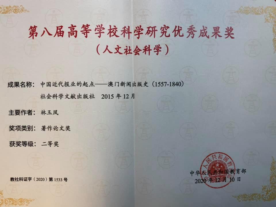 Dr Agnes Lam, associate professor in the Department of Communication, Faculty of Social Sciences, and director of the university’s Centre for Macau Studies, received a second prize at the Eighth Award for Outstanding Scientific Research in Higher Education (Humanities and Social Sciences), with her book titled ‘The Beginning of the Modern Chinese Press History – Macao Press History 1557-1840’. This monograph updated content related to Macao in the modern press history of China, and many of the revisions have been adopted by journalism history textbooks in the mainland. It is an influential and highly regarded work in academia.