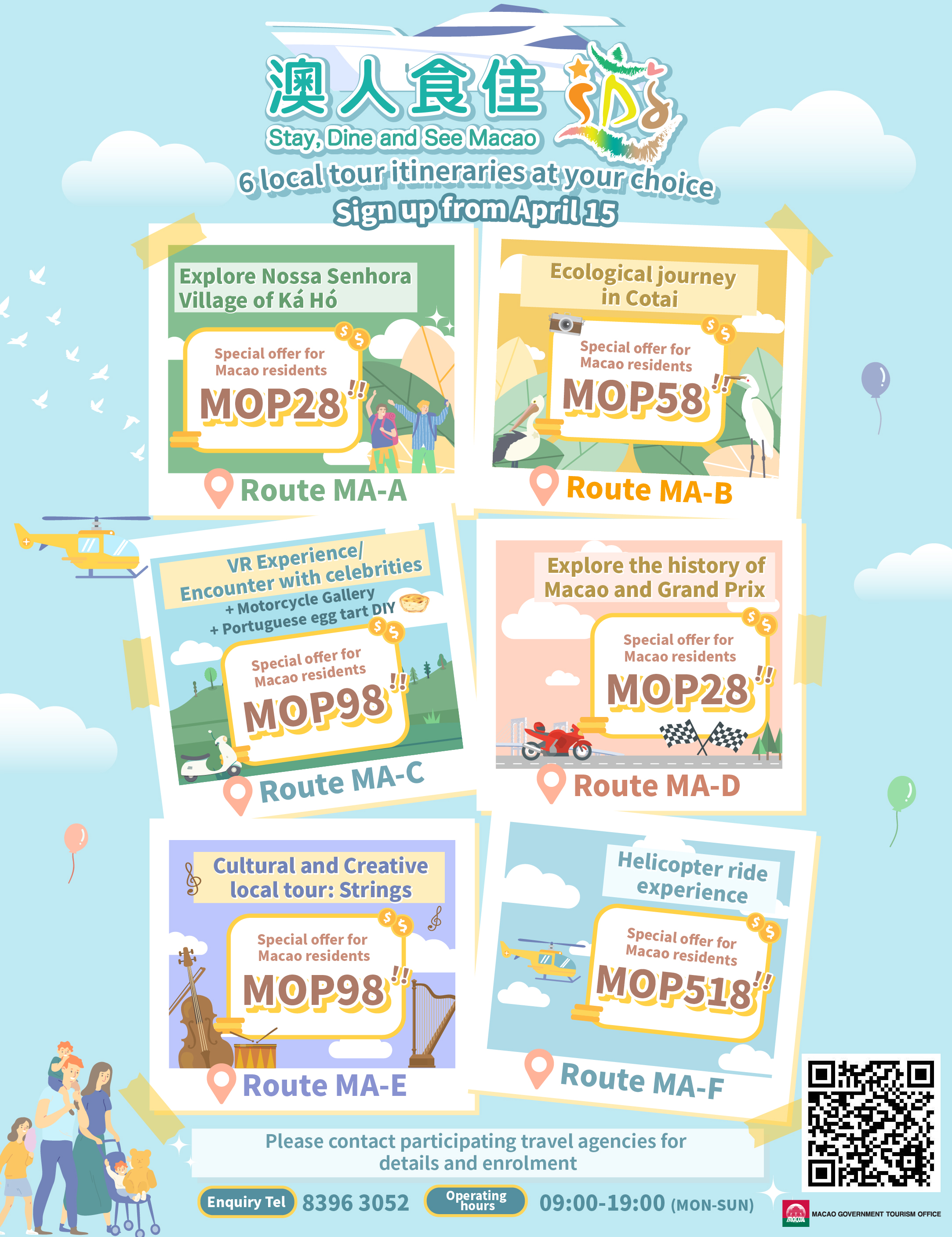 Just as the “Macao Ready Go! Local Tours” project last year, interested residents can opt for their favorite local tour itineraries or local hotels under the umbrella of the “Stay, Dine and See Macao” project at the sales outlets of accredited travel agencies with their valid Macao SAR resident identity cards, confirm their preferred tour date/time or hotel check-in date and complete the sign-up formalities by payment. Starting from 10:00 next morning (15 April), residents can sign up via accredited travel agencies for local tours and hotel staycation scheduled between April and June at this stage.