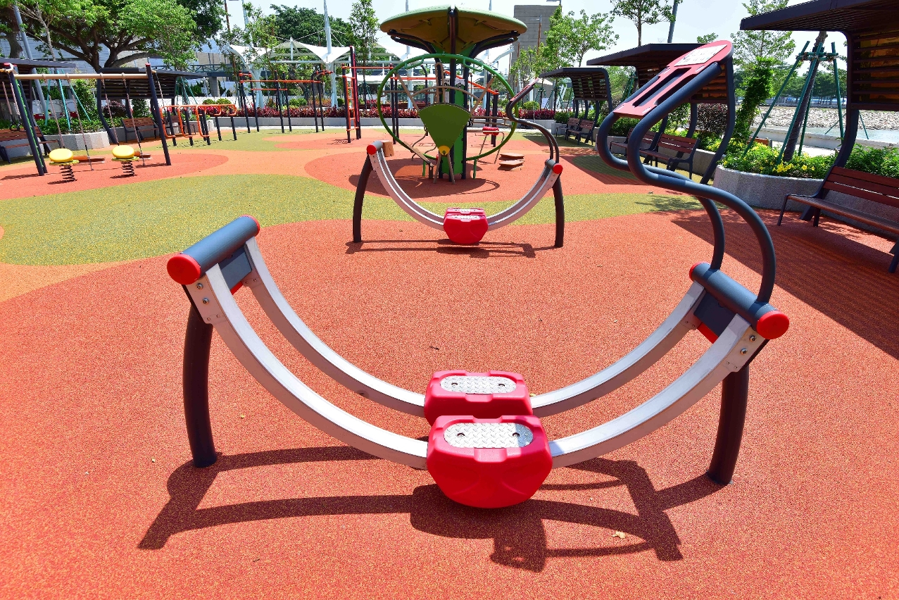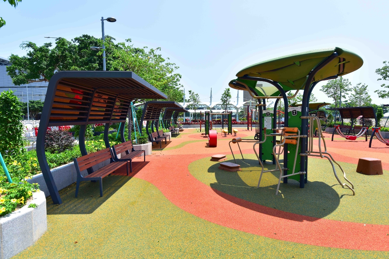 The playground, gateball court, roller skating rink and multi-functional court in the Leisure Area are open from 7 a.m. to 11 p.m. The other facilities such as the walking trail and the fitness and leisure area for adults are open all day.