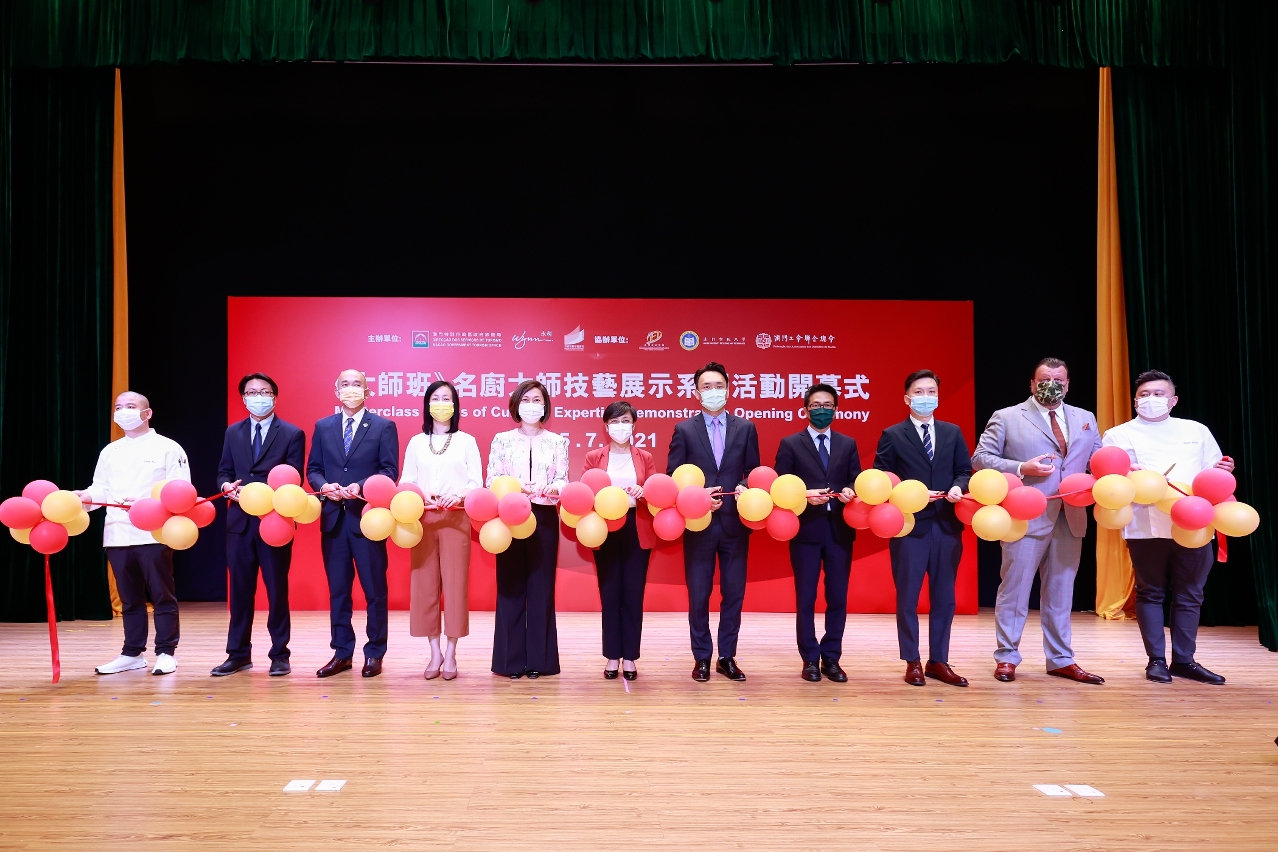 The opening ceremony for the Masterclass Series of Culinary Expertise Demonstration and the first culinary demonstration session were held at the Technical and Vocational Education Activity Centre on plot CN6a at Seac Pai Van today (15 July). MGTO Director Maria Helena de Senna Fernandes; IFTM President Fanny Vong; MGTO Deputy Director Cheng Wai Tong; Deputy Director of DSEDJ, Kong Chi Meng; President and Executive Director of Wynn Resorts (Macau) S.A., Linda Chen; Head of Division of Secondary Education of DSEDJ, Leong I On; Dean of Faculty of Hospitality and Tourism Management at MUST, Goh Kok Beng; Executive Vice President for Food & Beverage of Wynn Macau, Kristoffer Luczak; Vice President of Macao Federation of Trade Unions, Leong Wai Fong; Executive Chef of Yongfu, Xu Kunlei, and Executive Chef of Yongfu·Chen Yun, Zhou Chen, attended the occasion together with other guests.