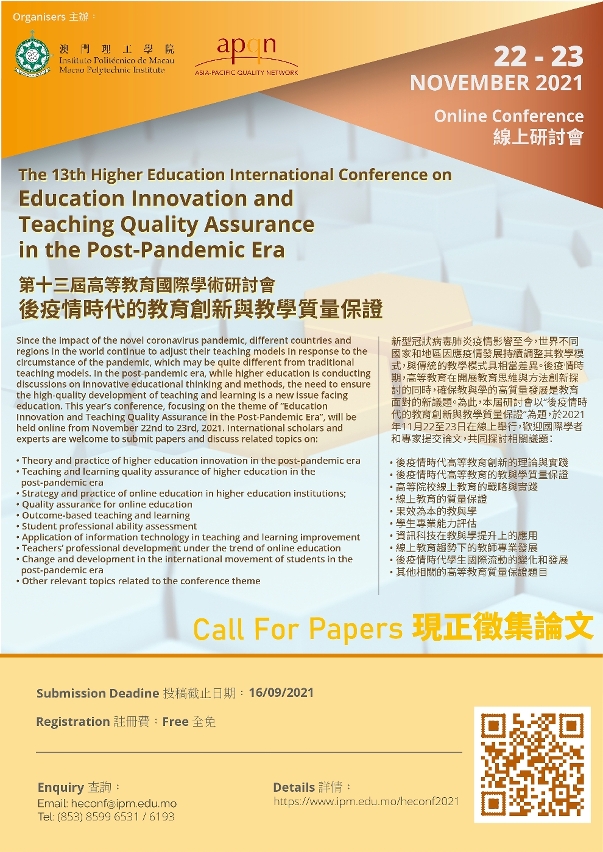The “HigHigherHigher Education International Conference” has been organised by MPI since 2009, and this is the seventh time an international conference focusing on teaching and learning quality assurance has been jointly organised with APQN. Since the impact of the novel coronavirus pandemic, different countries and regions in the world continue to adjust their teaching models in response to the circumstance of the pandemic, which may be quite different from traditional teaching models. In the post-pandemic era, while higher education is conducting discussions on innovative educational thinking and methods, the need to ensure the high-quality development of teaching and learning is a new issue facing education. This year’s conference, focusing on the theme of “Education Innovation and Teaching Quality Assurance in the Post-Pandemic Era”, will be held online from November 22nd to 23rd, 2021, and offers an exchange platform for Macao and higher education assurance agencies and well-known scholars from around the world. The conference aims to discuss various factors affecting education innovation and teaching quality assurance in the post-pandemic era from multiple perspectives. Related topics include theory and practice of higher education innovation in the post-pandemic era, teaching and learning quality assurance of higher education in the post-pandemic era, strategy and practice of online education in higher education institutions, quality assurance for online education, outcome-based teaching and learning, student professional ability assessment, application of information technology in teaching and learning improvement, teachers’ professional development under the trend of online education, and change and development in the international movement of students in the post-pandemic era.