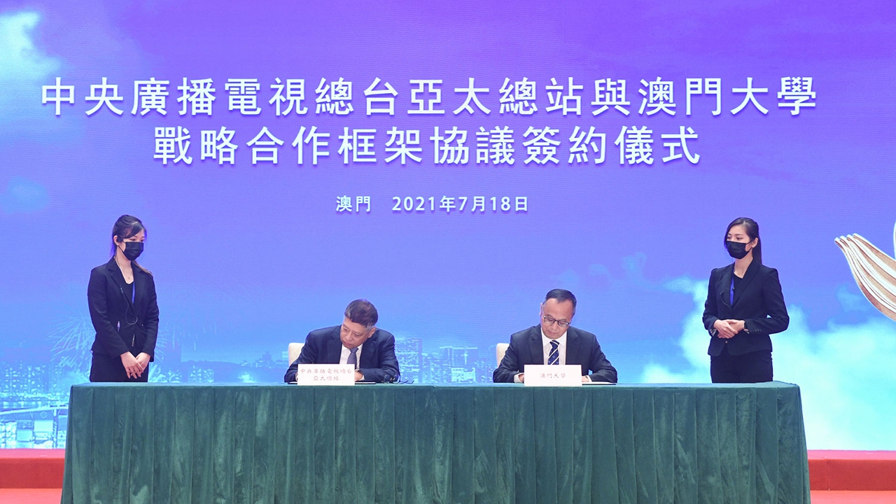 A ceremony for deepening the strategic partnership between China Media Group (CMG) and the government of the Macao Special Administrative Region (SAR) was held today (18 July). The event was co-organised by CMG and the Macao SAR government, and was hosted by TDM, CMG’s Asia-Pacific headquarters, and the University of Macau (UM). One of the agendas of the ceremony was the signing of a strategic partnership framework agreement between UM and CMG’s Asia-Pacific headquarters. Macao SAR Chief Executive Ho Iat Seng delivered a speech at the ceremony, in which he said that the signing of a strategic partnership agreement between CMG’s Asia-Pacific headquarters and UM would surely provide a bigger platform for higher education institutions in Macao to enhance their academic programmes in communication and to train more professionals in the field.