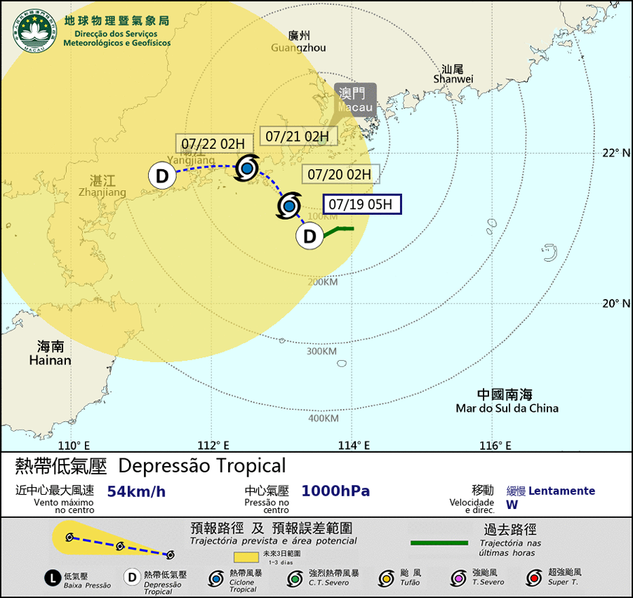 The tropical depression over the northern part of South China Sea has a relatively small circulation, however, it is expected to linger close to Macao and may further intensify. Its related rainbands will bring unsettled weather to Macao, winds will strengthen with heavy showers in the next few days. The SMG will monitor closely the development of the tropical cyclone. Besides, though it is not during the high phase of the astronomical tide on the 19th and 20th , public should still be alert to flooding owing to heavy rain.