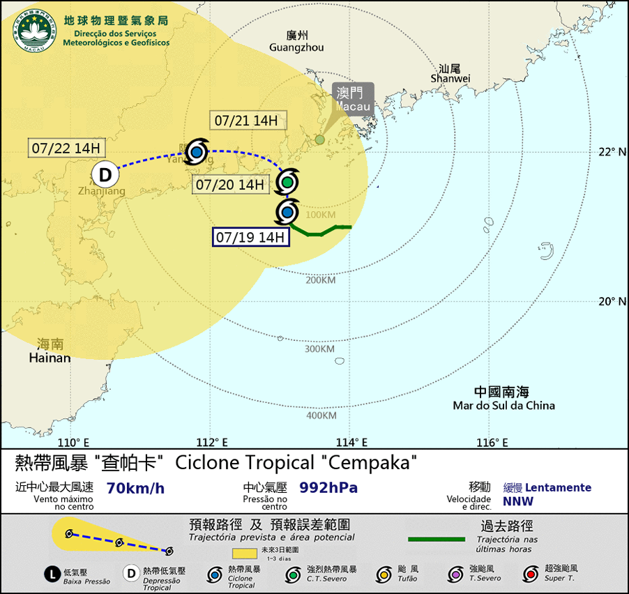 Tropical Storm Cempaka possesses a relatively small circulation and is expected to move northerly within the next 24 hours. It will be closest to Macao during midnight and morning on the 20th, passing within 100km southwest of Macao. Affecting by Cempaka’s circulation, public should be aware that winds will be strengthening to strong wind level with heavy showers. If Cempaka intensifies further and moves closer to Macao, the possibility of issuing Typhoon Signal No.8 should not be neglected. The SMG will monitor closely the development of Cempaka.
